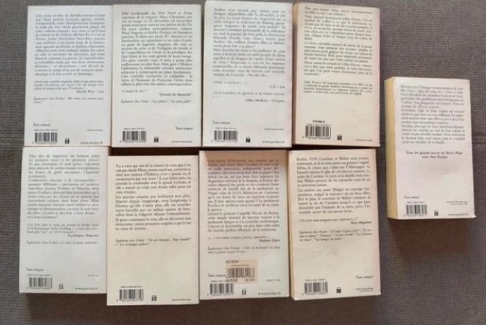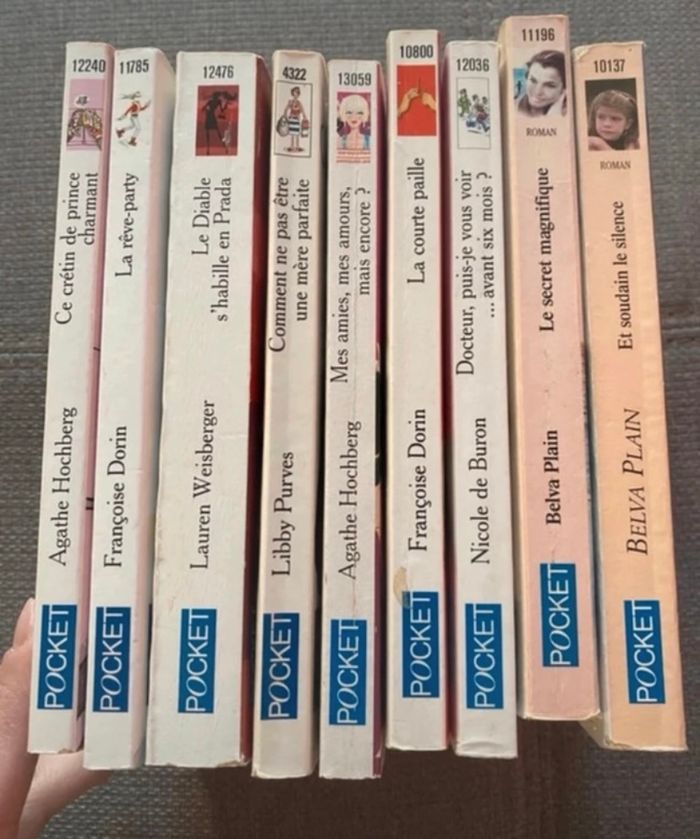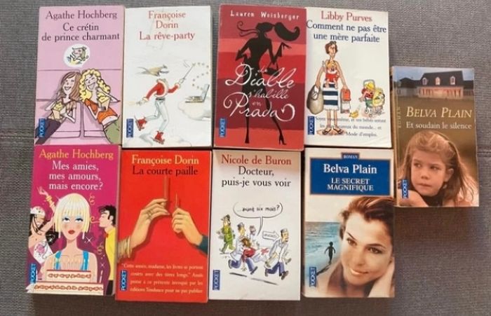 Lot de 9 livres : - Et soudain le silence de Belva Plain, comporte des taches jaunies - Le secret magnifique de Belva Plain, comporte des taches jaunies - Docteur puis-je vous voir avant six mois de Nicole de Buron - La courte paille de Françoise Dorin, comporte des taches jaunies - Mes amis mes amours mais encore d’Agathe Hochberg, comporte des taches jaunies - Comment ne pas être une mère parfaite de Libby Purves, comporte des tâches jaunies - Le diable s’habille en Prada de Lauren Weisberger, comporte des taches jaunies - La rêve party de Françoise Dorin, la couverture a été réparé avec du scotch (voir photo) - Ce crétin de prince charmant d’Agathe Hochberg, comporte des taches jaunies