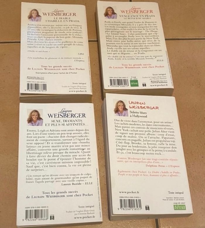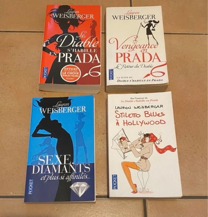 Lot de 4 livres de Lauren Weisberger : - le diable s’habille en Prada (obtenu à l’achat de livres) - vengeance en Prada le retour du diable (tâche sur le bas de la tranche) - sexe, diamants et plus si affinités - stiletto blues à Hollywood Ils sont en bon état général voir très bon