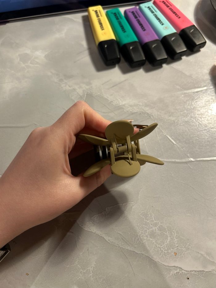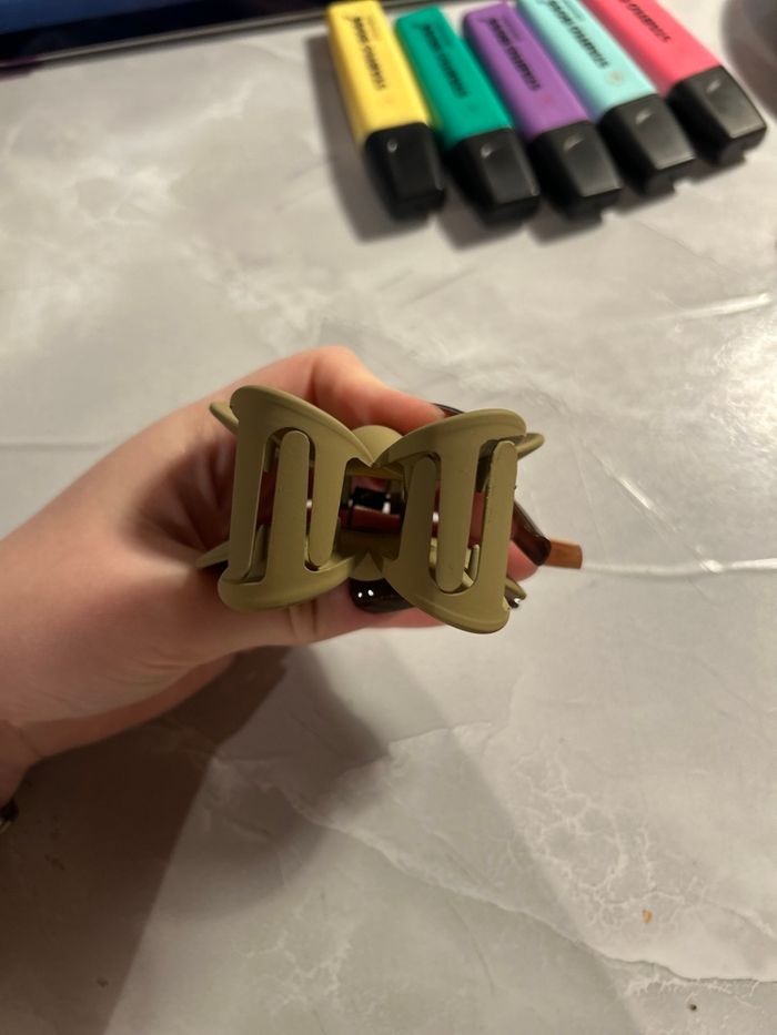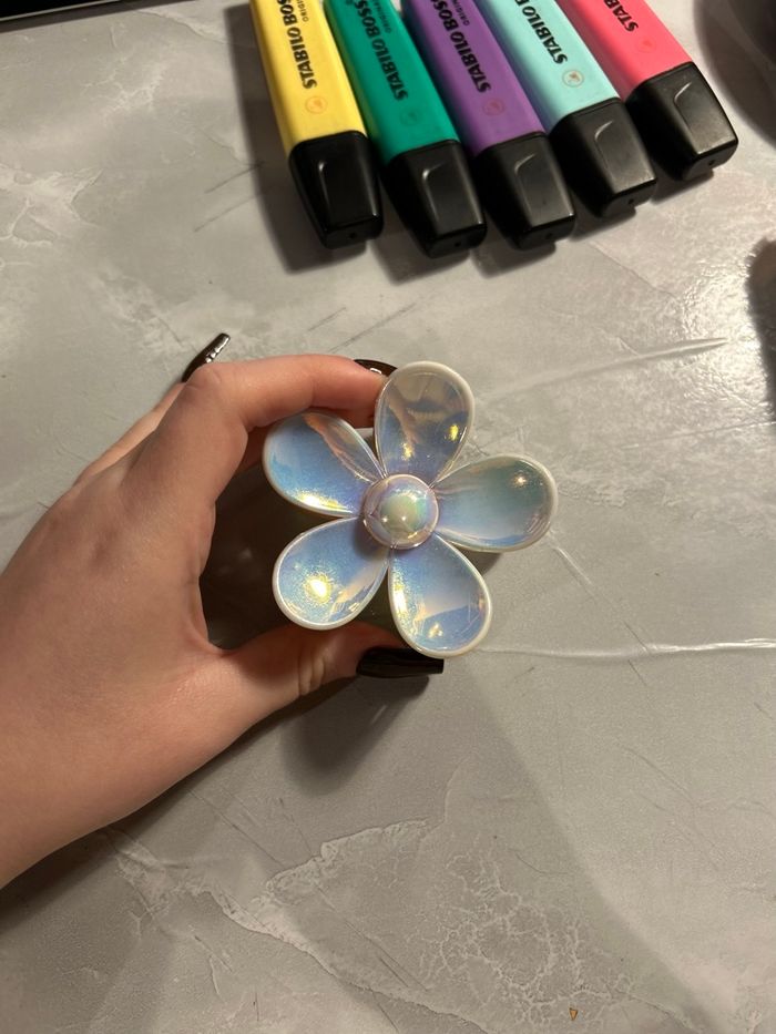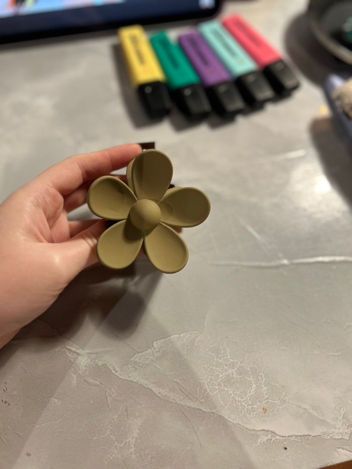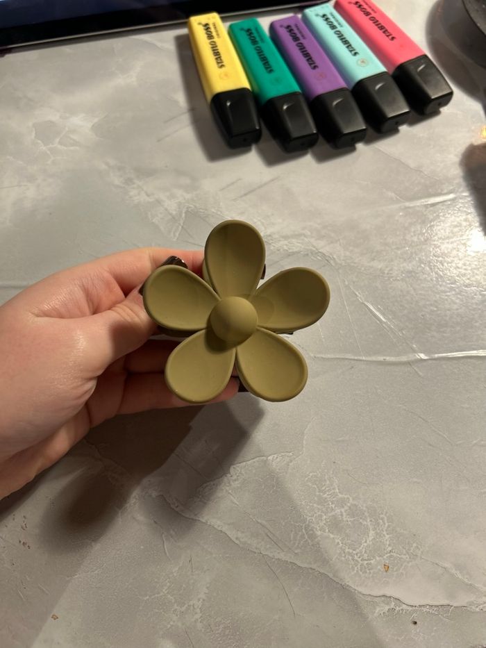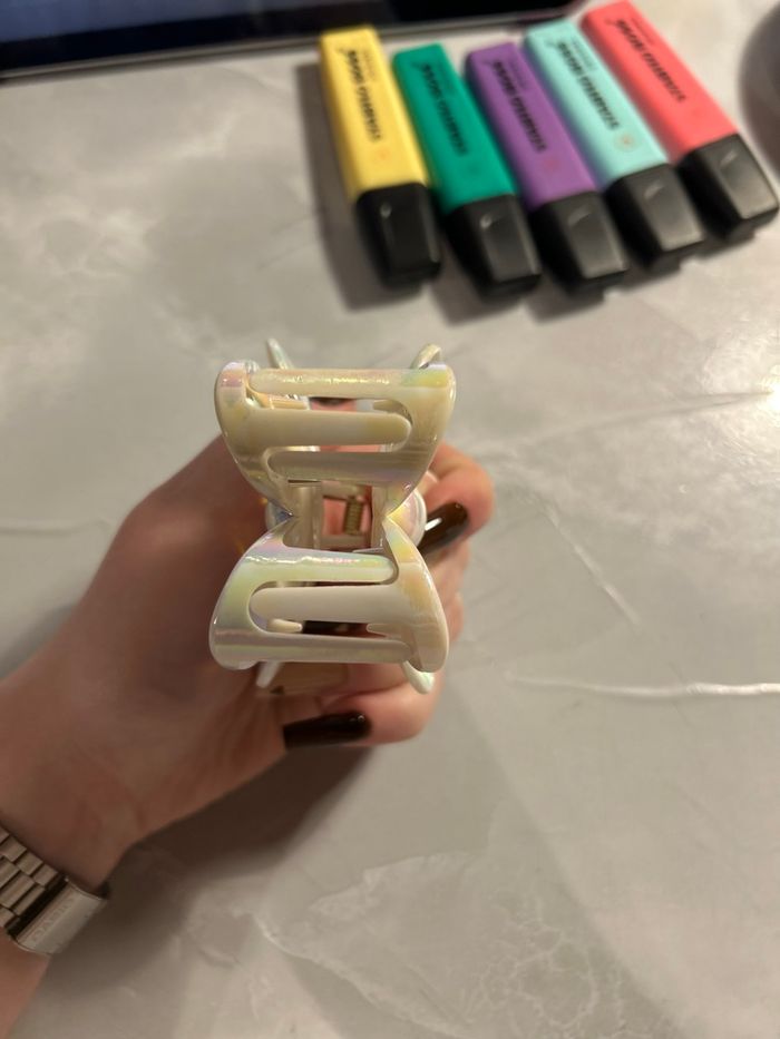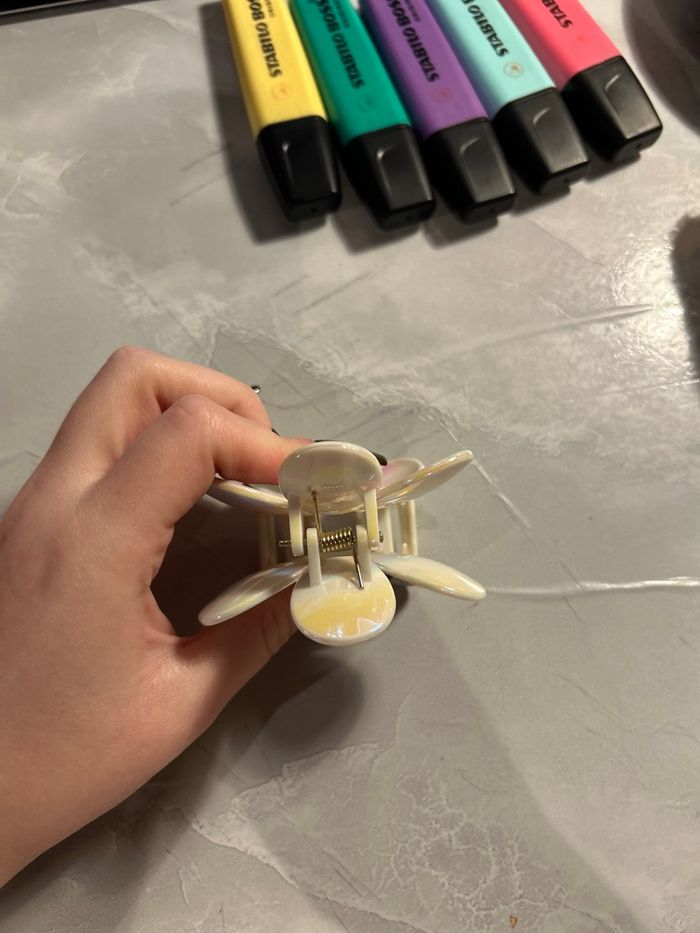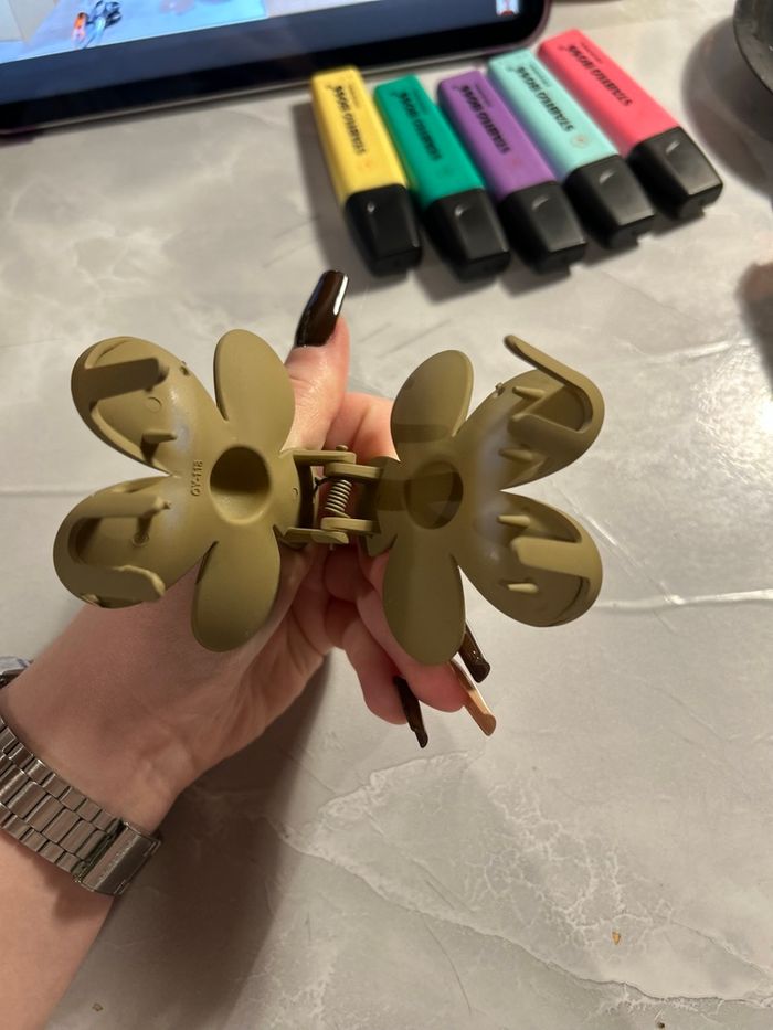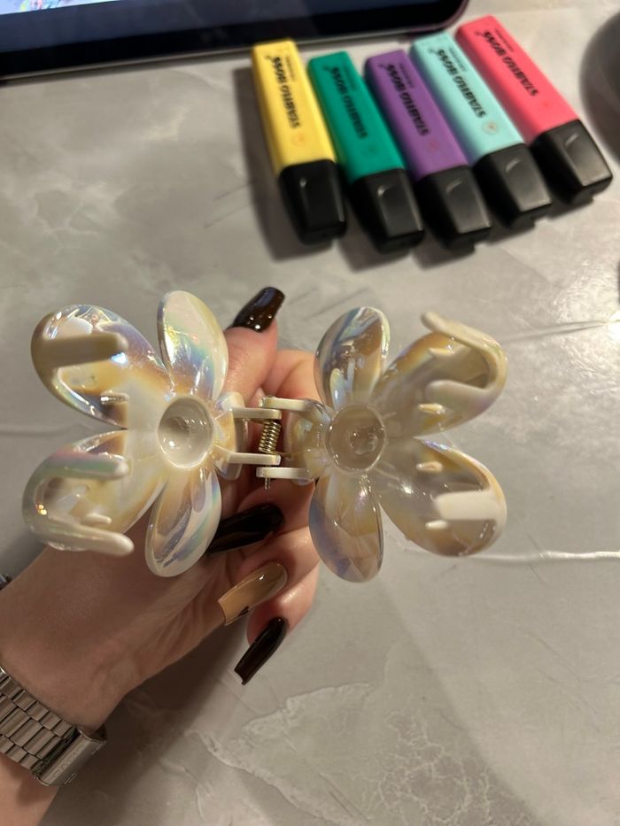 Lot de 2 pinces crabe en forme de fleur, coloris brun mat et blanc métallisé. Jamais utilisées, neuves sans étiquette. Très jolies et solides, parfaites pour sublimer vos coiffures 🌼 Prix d’achat : 5 € / pièce