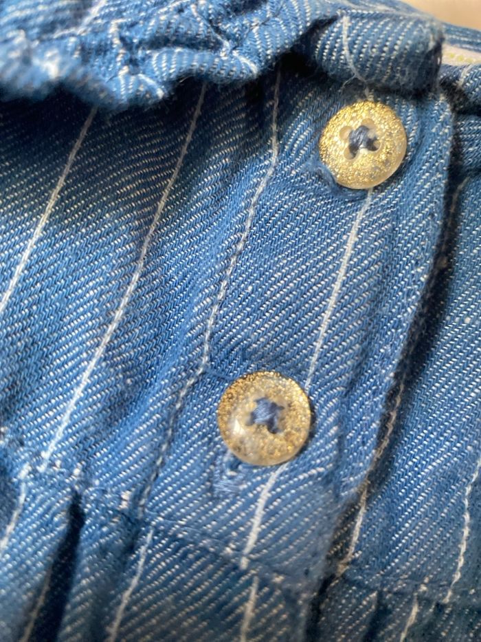 Robe manches longues col Claudine avec fin volant Tissu jeans fines rayures blanches Taille 2 ans 86 cm Boutons paillettes dorées Probablement coton polyester, plus d'étiquette Tape à l'œil