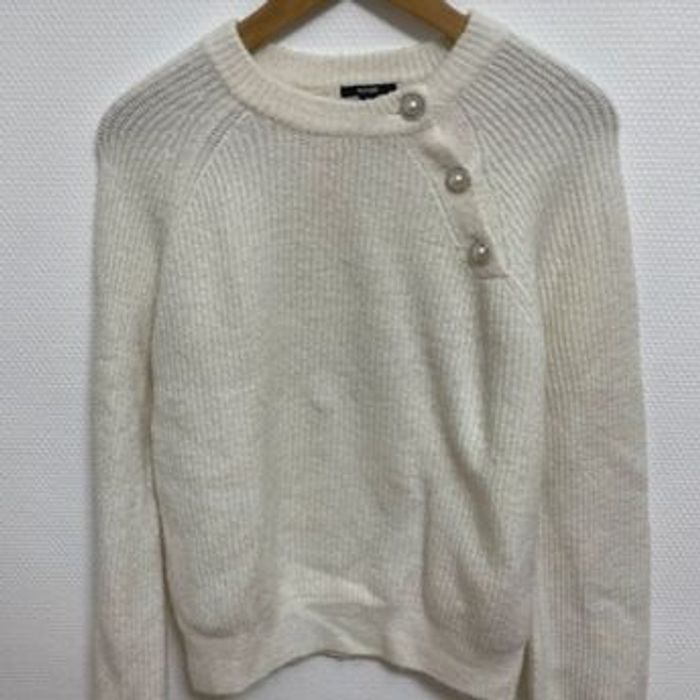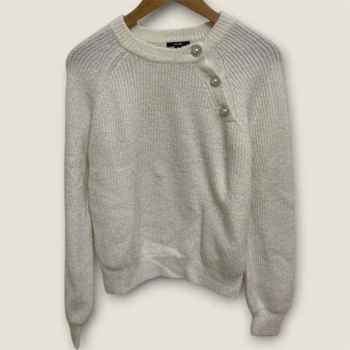 Pull en maille. Détails élégants avec trois boutons ornés sur l’épaule. Coupe droite, manches longues, col rond. Porter très rarement - très bon état voir neuf Taille XS mais convient pour une personne portant du S