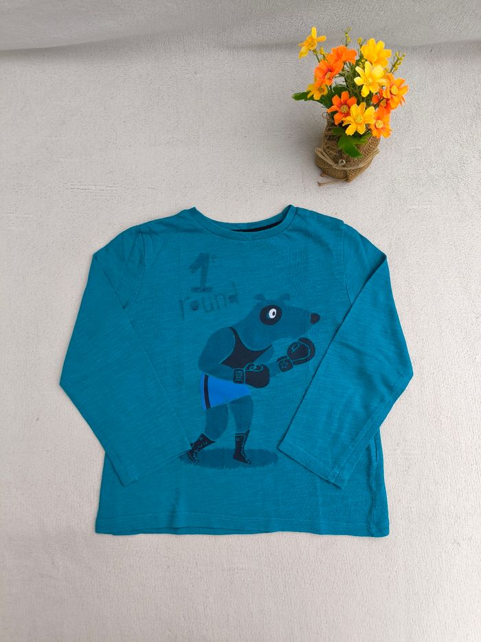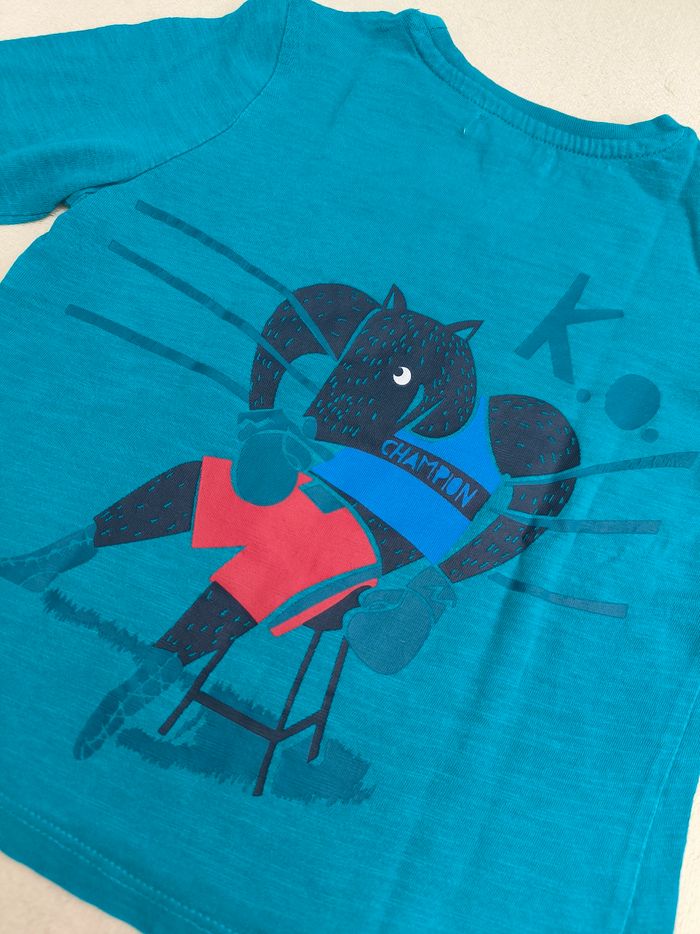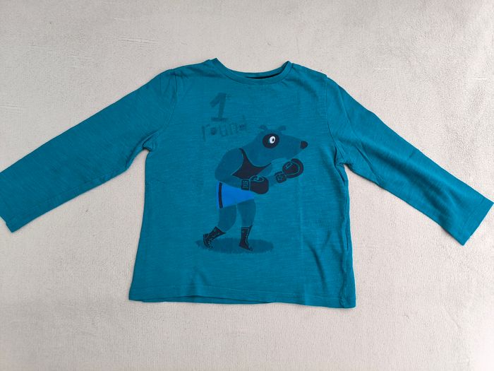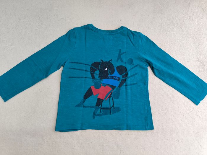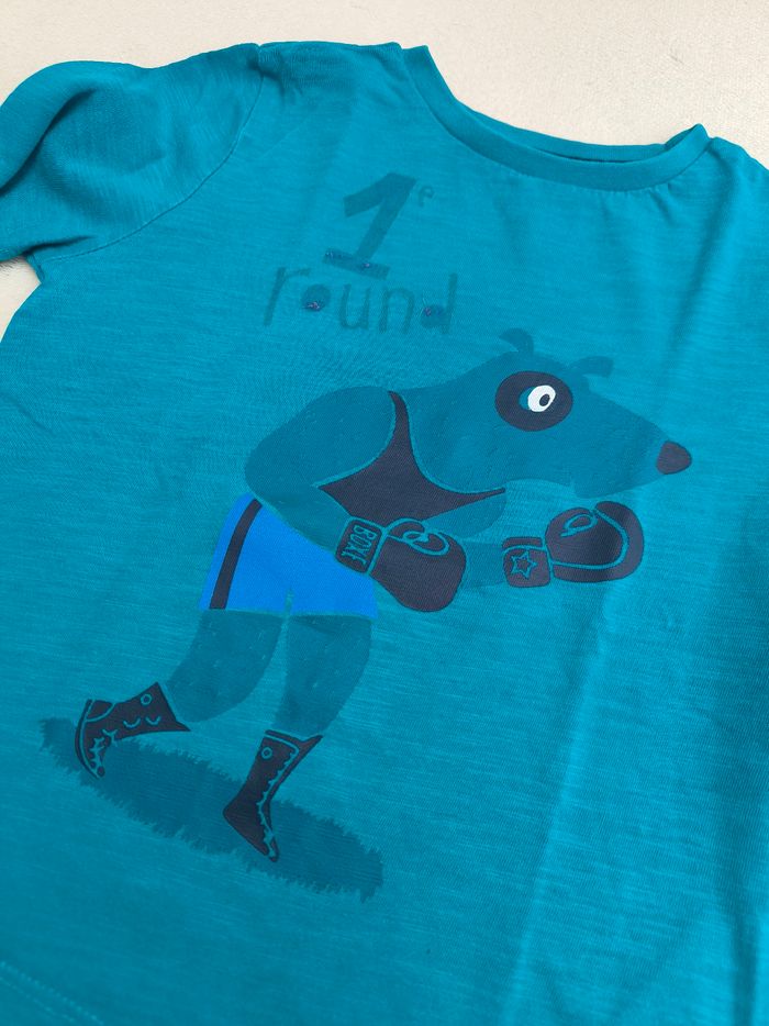 T-shirt à manches longues Marque Du Pareil au Même Taille 3 ans, 98 cm • Coloris bleu turquoise, marine • Imprimés hippopotame et renard, inscription "1e round, k.o." • Coton fin • Velours enlevé sur l'inscription En très bon état #evelyne_garcons_3ans #evelyne_garcons