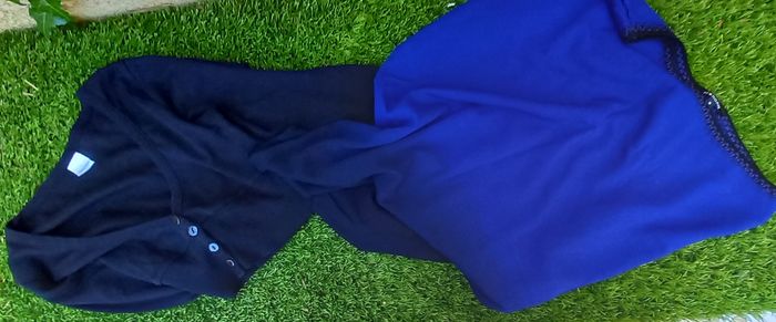 - Boléro Camaieu, manches longues, coloris noir, boutons, composition 100% coton largeur épaules 38 cm - aisselles 40 cm longueur épaule-bas = 36 cm aisselles-bas 19 cm - Pull Morgan manches chauve-souris, à enfiler, étiquette de composition coupée, coloris noir et bleu largeur épaules 44 cm - aisselles 55 cm longueur épaule-bas = 70 cm envoi rapide et soigné - possibilité de faire une offre en lots