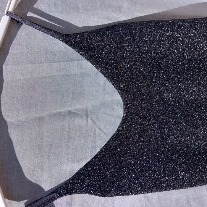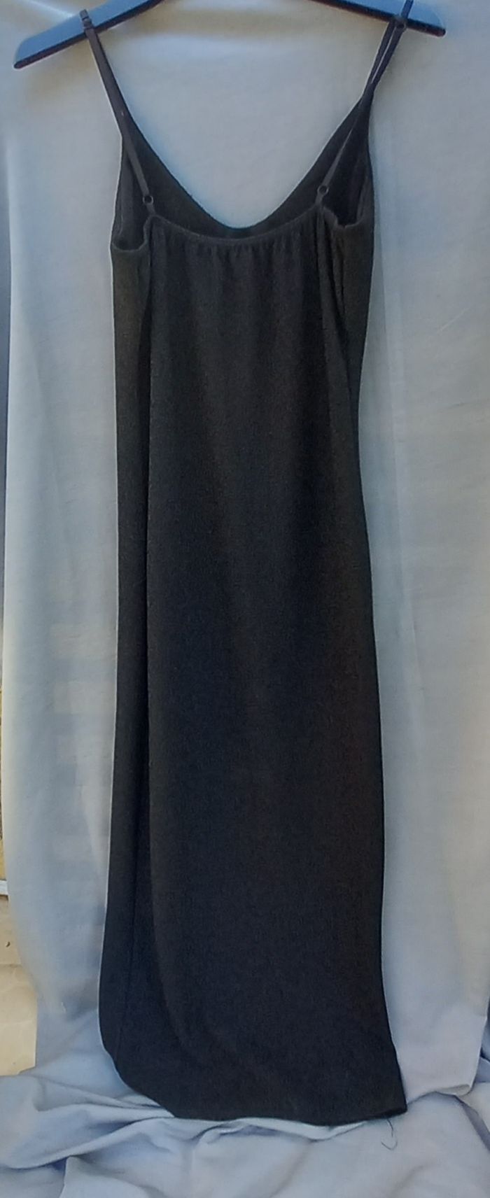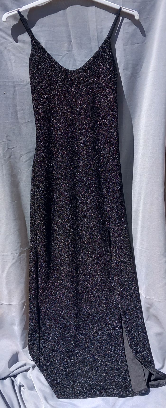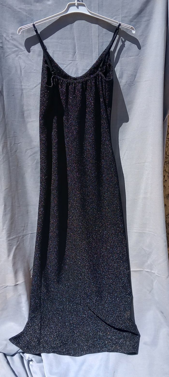 bretelles réglables, à enfiler, coloris noir fil métallique (effet brillant), Fabriqué en France, 97% polyester 3% élasthanne, article neuf - jamais porté, largeur aisselles 37 cm Longueur aisselles-bas 133 cm, longueur ouverture 73cm possibilité de faire une offre en lots