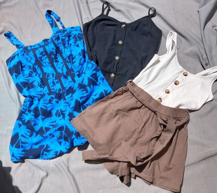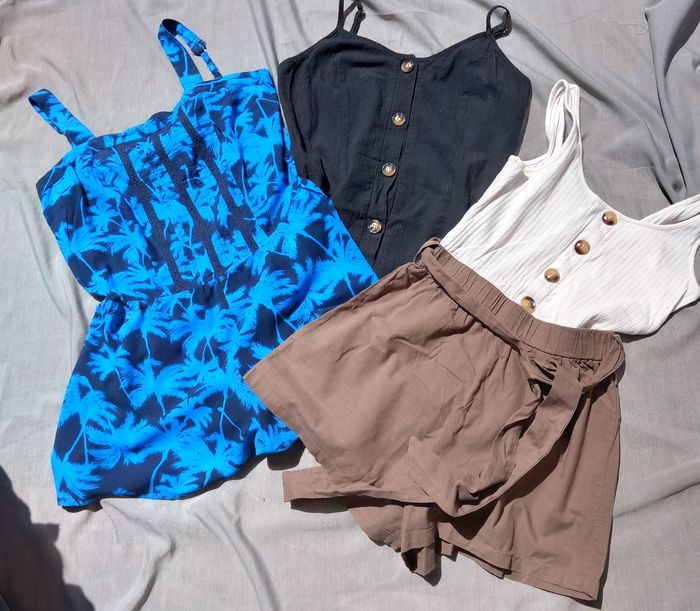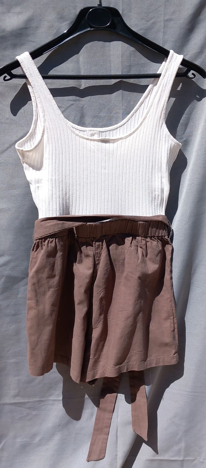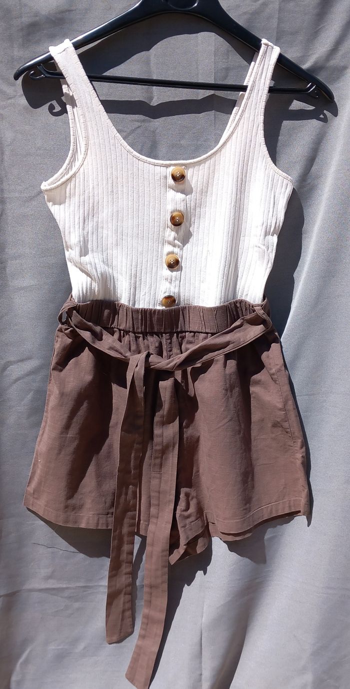 - Combishort Shein à larges bretelles, haut coloris crème et bas coloris kaki, Taille large élastique avec passants et ceinture, à enfiler, 93.2% coton 6.8% élasthanne Largeur taille = 35 cm, largeur bas short = 34 cm, Longueur taille-Bas 33 cm et entrejambe-bas 5 cm, Longueur Taille - entrejambe 34 cm - Haut largeur aisselles 37 cm longueur aisselles-taille 21 cm épaules-taille 31 cm
