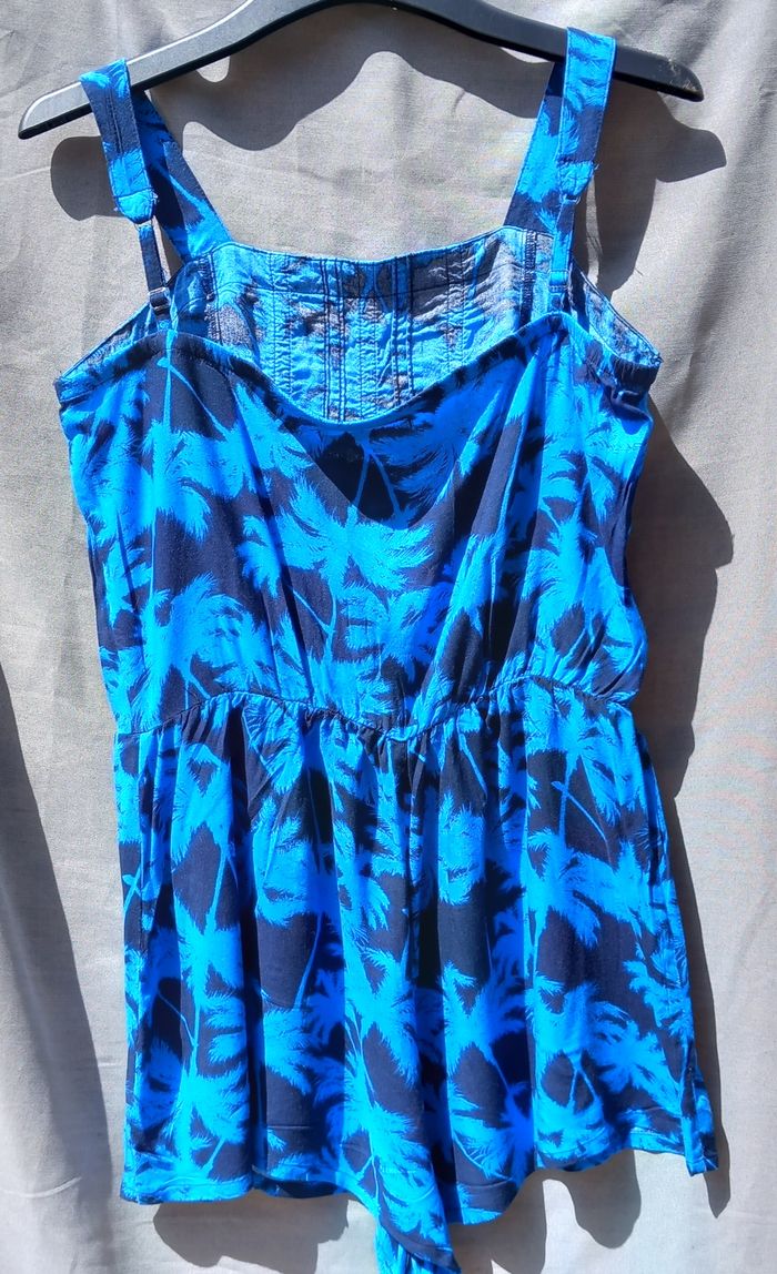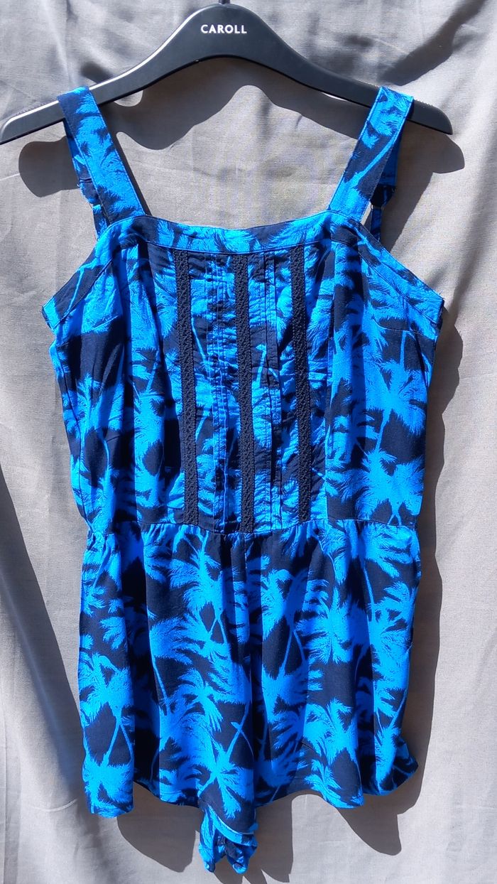 - Combishort Atmosphère à bretelles réglables, tissu imprimé palmiers coloris bleu, Taille élastique sur le dos, à enfiler, 100% viscose Largeur taille = 37 cm, largeur bas short = 36 cm, Longueur taille-Bas 30 cm et entrejambe-bas 4 cm, Longueur Taille - entrejambe 38 cm - Haut largeur aisselles 44 cm longueur aisselles-taille 23 cm