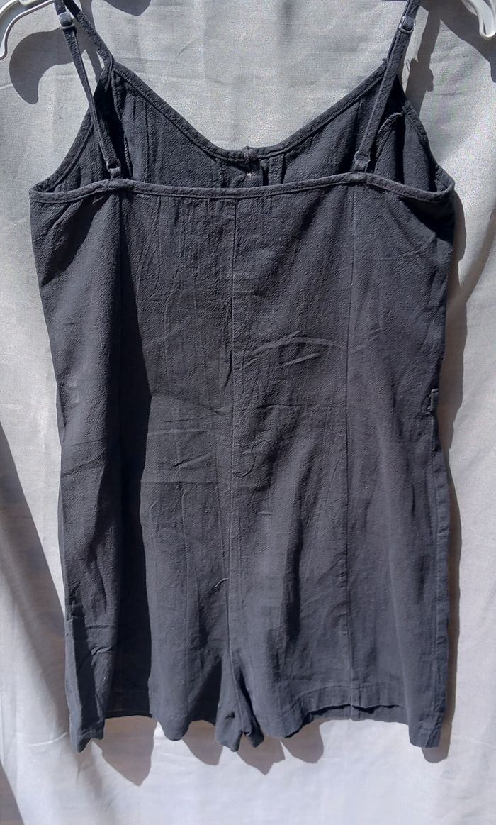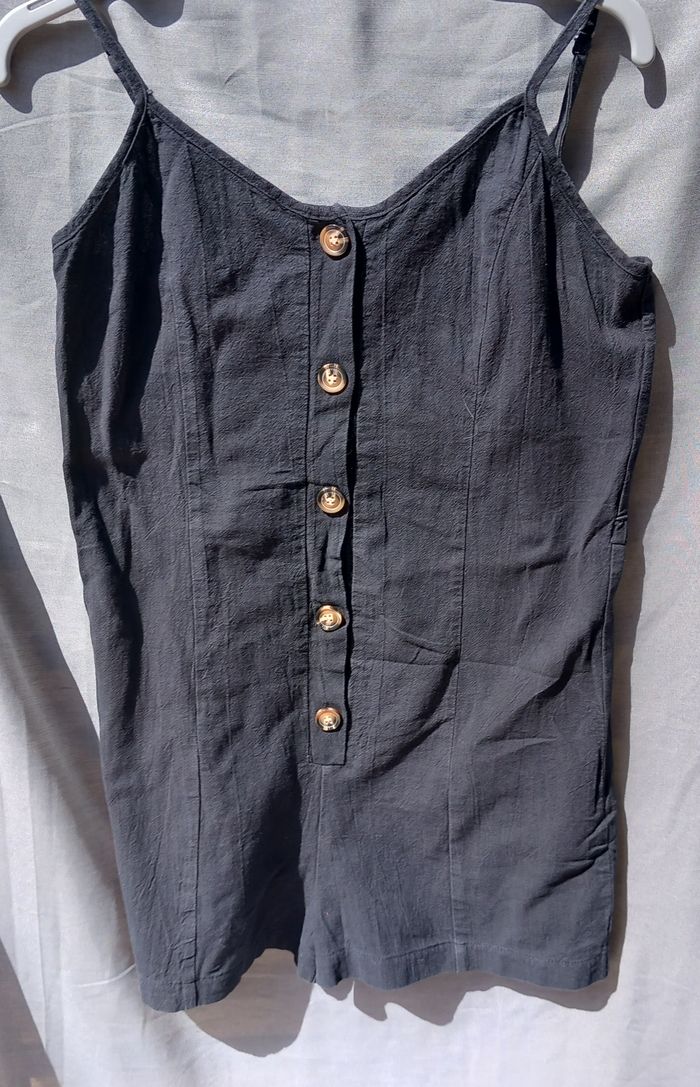- Combishort Romwe à bretelles réglables, coloris noir, boutonnage sur l'avant, 2 passants pour fine ceinture, 97% polyester 3% spandex Largeur taille = 40 cm, largeur bas short = 31 cm, Longueur aisselles-Bas 58 cm et entrejambe-bas 5 cm, - largeur aisselles 42 cm longueur