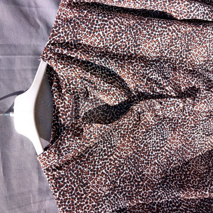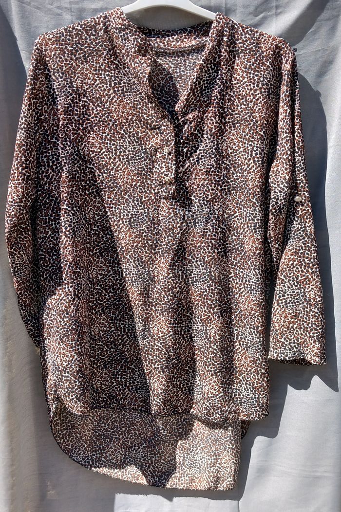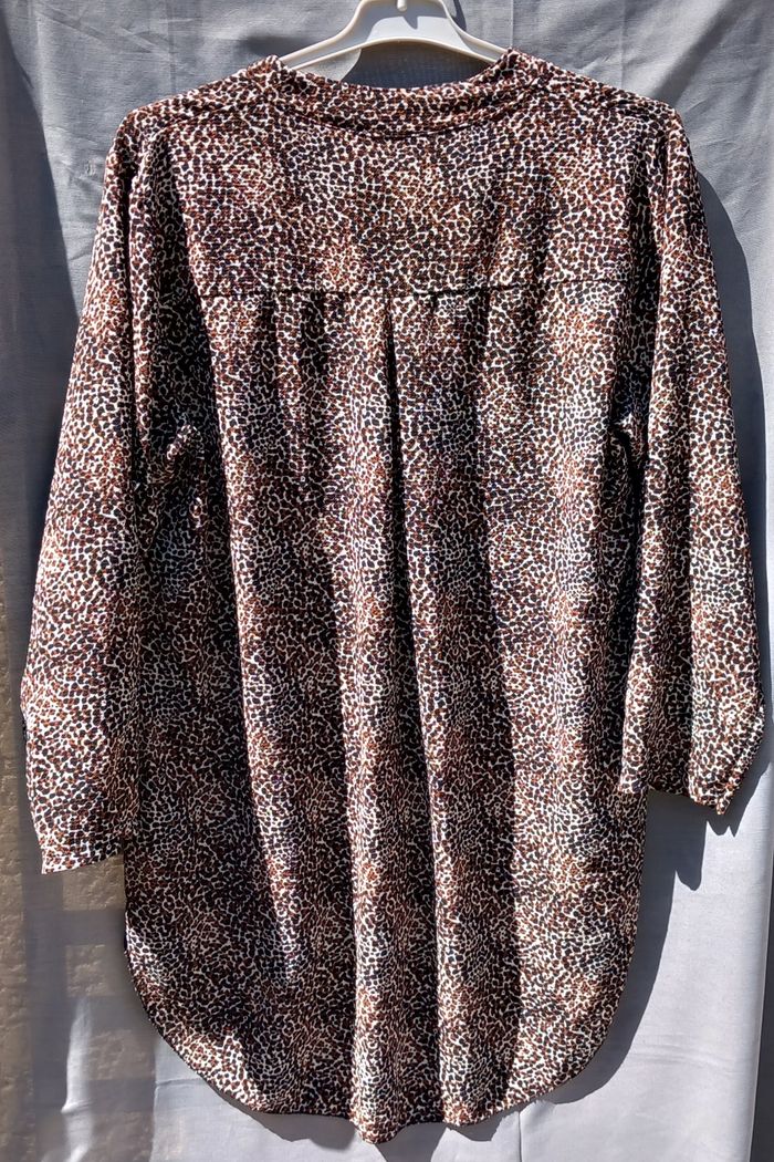 - Robe made in italy, manches 3/4 avec possibilité de les raccourcir avec patte et bouton, tissu imprimé noir marron écru, boutonnage, col mao, à enfiler, bas arrondi, 95% polyester 5% élasthanne, largeur épaules 43 cm , aisselles 58 cm, longueur épaules-bas 67 cm et aisselles-bas 44cm