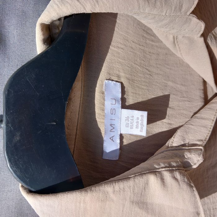 - Robe Amisu avec col, boutonnage, 2 poches avec rabat, manches longues avec boutons, passants de chaque côté pour 1 ceinture, étiquette de composition coupée, largeur épaules 39 cm , aisselles 48cm, longueur épaules-bas 82 cm et aisselles-bas 59 cm