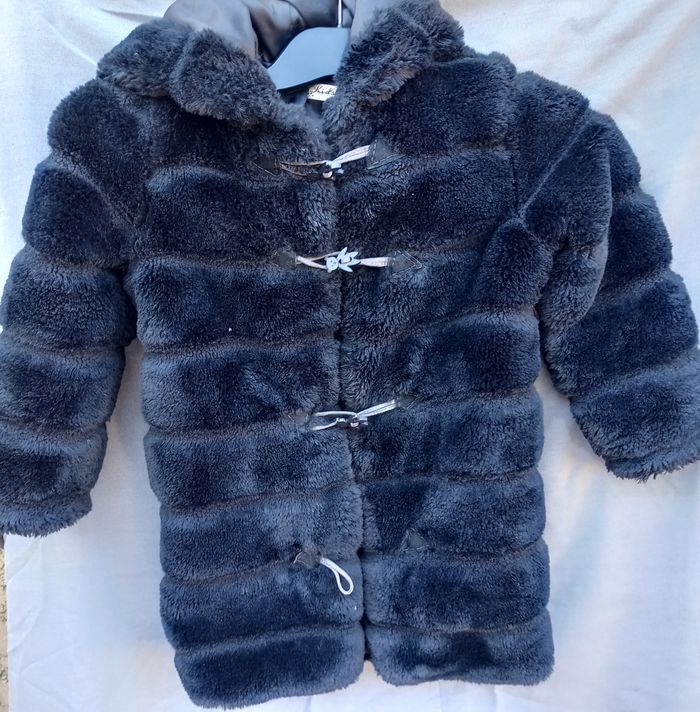 Manteau avec capuche, coloris noir, entièrement doublé, 2 poches, boutonnage petits oursons, manque 1 boutonen bas, 100% polyester Possibilité d offre en lots. Envoi rapide et soigné