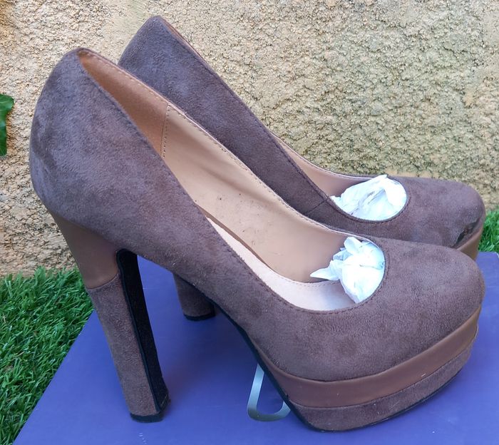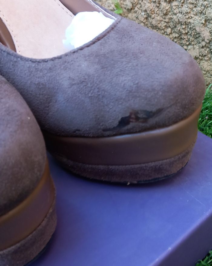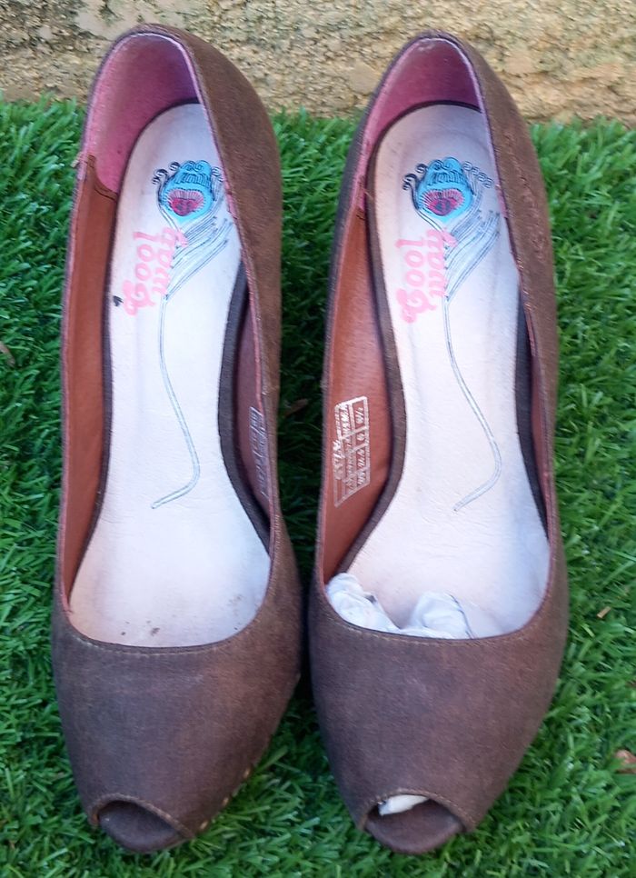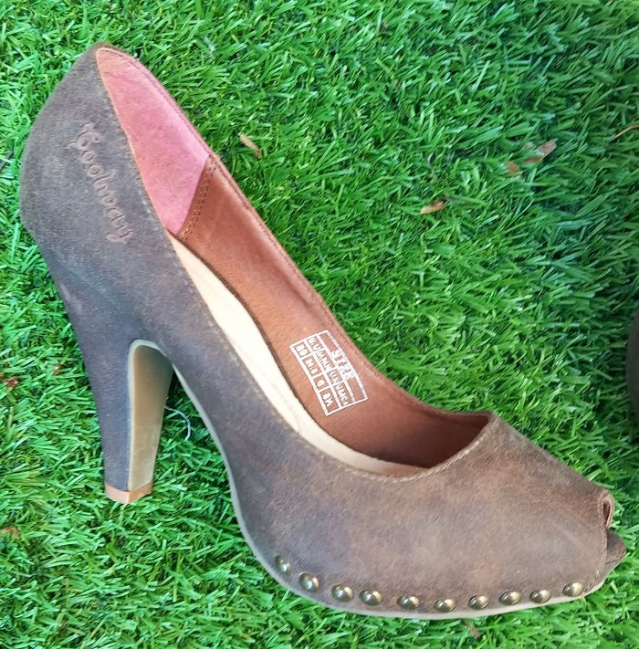 - Escarpins Ana Lublin Vera Pelle, Talons 14 cm de hauteur, Plateforme à l'avant 4 cm hauteur, coloris marron, bout rond, vendu avec talonnettes de rechange, 1 défaut sur l'avant (défaut constaté à la livraison), article porté 1 fois - très bon état proche du neuf - Escarpins Cool Way, Talons 10 cm de hauteur, Plateforme à l'avant intérieur 1 cm hauteur, coloris marron, bout ouvert, avant clouté pour 1 joli effet, article peu porté et vendu tel que sur les photos taille 39 Possibilité d'offre en lots. Envoi rapide et soigné