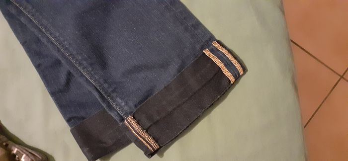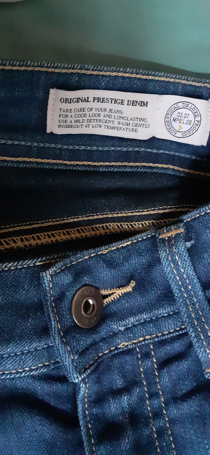Vends un jean Denim 65 % coton, 35 % polyester, bas des jambes à revers, couleur bleu, marque Melia Meltin'Pot, taille W27 L34 (taille 36). Longueur entrejambe : 72 cm