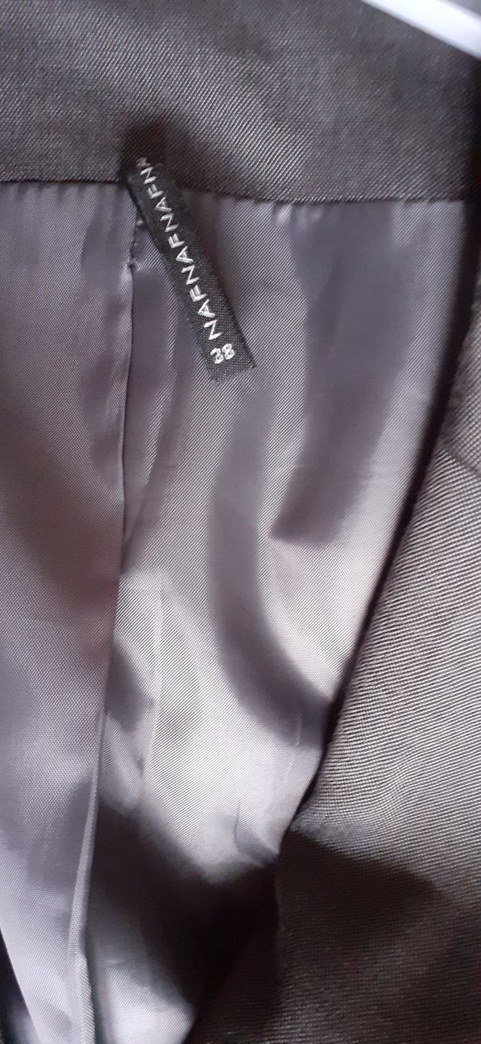 Vends un blazer 51 % viscose, 47 % laine, 2 % élasthanne, doublé, légèrement cintré, couleur gris, marque Naf Naf, taille 38. Longueur dans le dos : 57 cm.