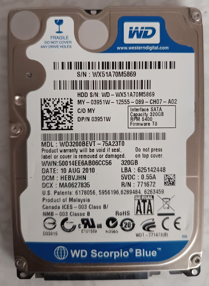 Disque Dur 320Go SATA 2.5 Western Digital WD3200BEVT 5400rpm - 75A23T0