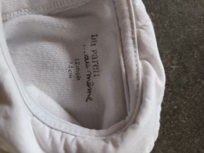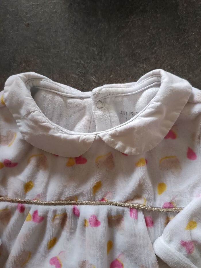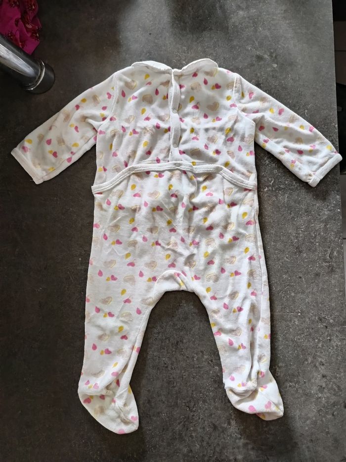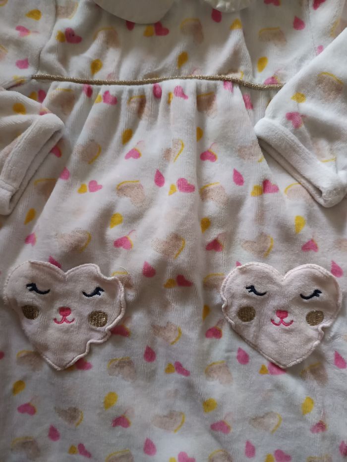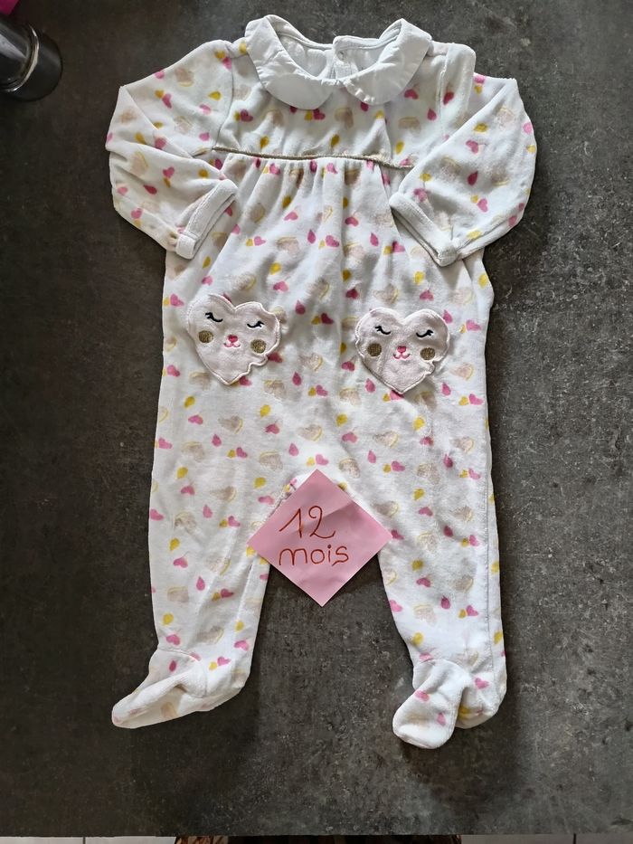 Joli pyjama en velours blanc avec petit col, motifs coeurs roses et jaunes, liseré doré au niveau de la taille, 2 petites poches en forme de coeurs EXCELLENT état, peu porté ! Taille 12 mois