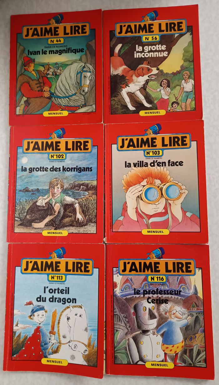 Lot de 6 livres anciens de la collection j'aime lire n° 44,56, 102,103,113,116 - N°44 Ivan le magnifique - N°56 La grotte inconnue (1981) - N°102 La grotte des Korrigans - N°103 La villa d'en face - N°113 L'orteil du dragon - N°116 Le professeur cerise Tous les livres sont en bon état général pages écrites indiquant les réponses des jeux Marque-page non présent