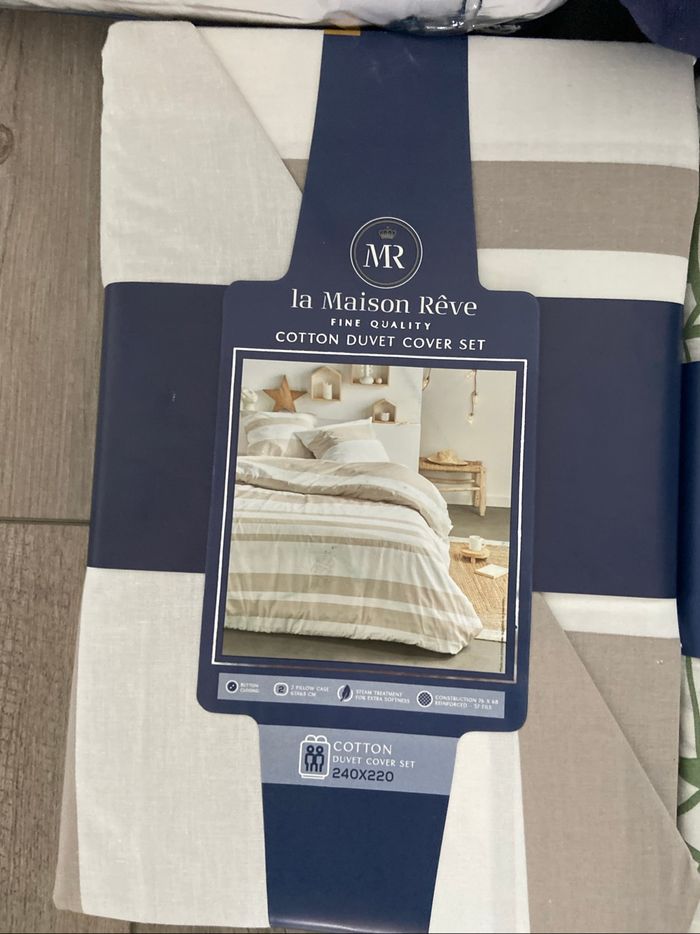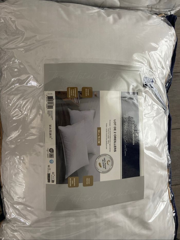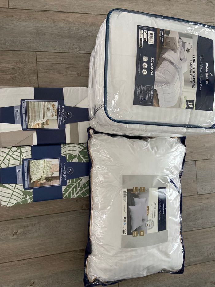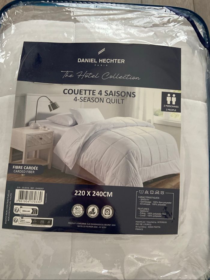 Ensemble literie Daniel hechter neuf,1 couette Daniel hechter 220/240 neuf chaude 500gr/m2,2 oreillers Daniel hechter 50/70, coutures dorées ,garnissage en plumes de canard neuf et 2 parures 220/240 neuf 100% coton
