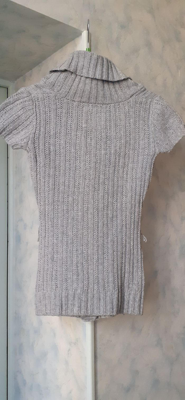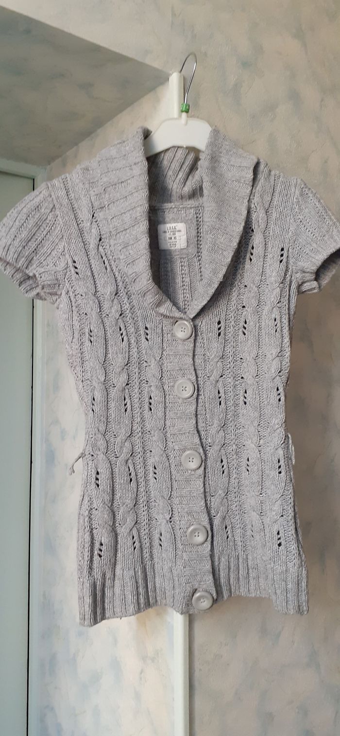 Vends un gilet en grosses mailles, manches courtes, col châle, 60 % coton, 40 % polyamide, 10 % laine, 2 passants pour une éventuelle ceinture (non fournie), couleur gris clair unie, marque LOGG H&M, taille XS EUR (34-36). Longueur dans le dos : 54 cm.