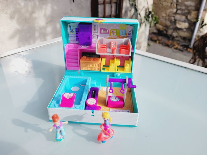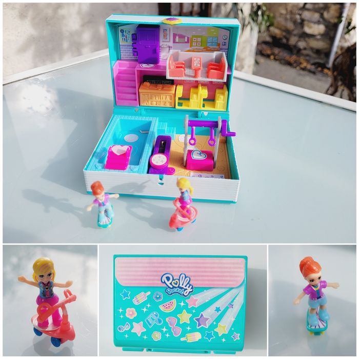 POLLY POCKET COFFRET AVENTURES À L'ÉCOLE Ce coffret nomade en forme de livre d’école révèle un décor d’école avec 5 surprises, 1 skateboard, 1 trottinette et 1 feuille d’autocollants (qui ont déjà été collé à l'intérieur). Polly et Shani peuvent aller à l’école en trottinette et en skateboard puis résoudre des opérations au tableau, récupérer leur déjeuner dans les casiers et aller manger à la cafétéria. À l’heure du cours de sport, Polly montre ses talents de gymnaste sur les anneaux de la salle de gym ou la poutre ! Quant à Shani elle se distingue à la piscine ! En très bon état Mes autres Polly Pocket : #pollypocketmooglou #jouetsmooglou