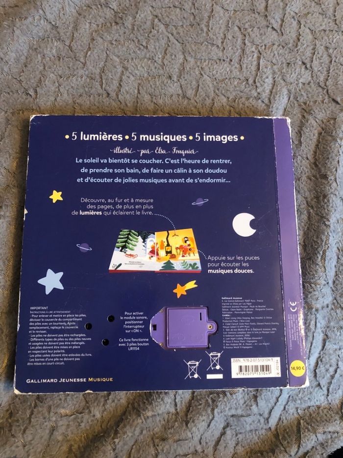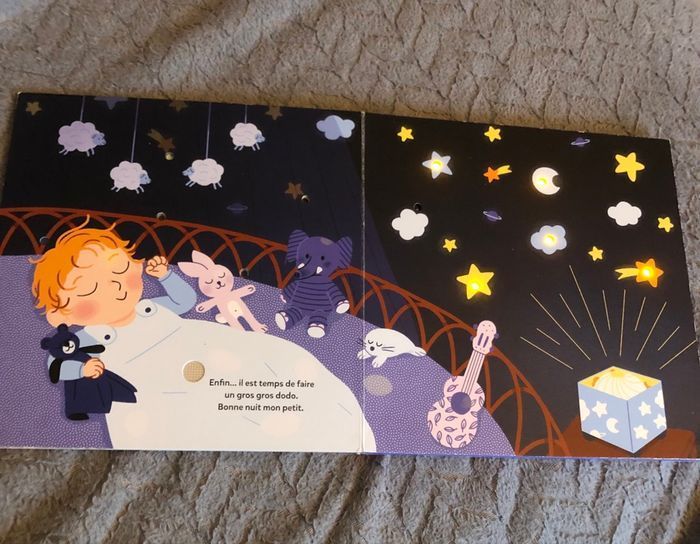 Imagiers sonores et lumineux avec 5 musiques différentes et une lumières de plus à chaque pages. Piles neuves
