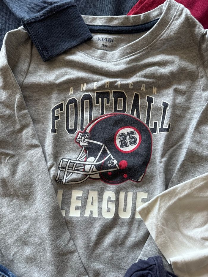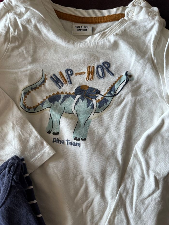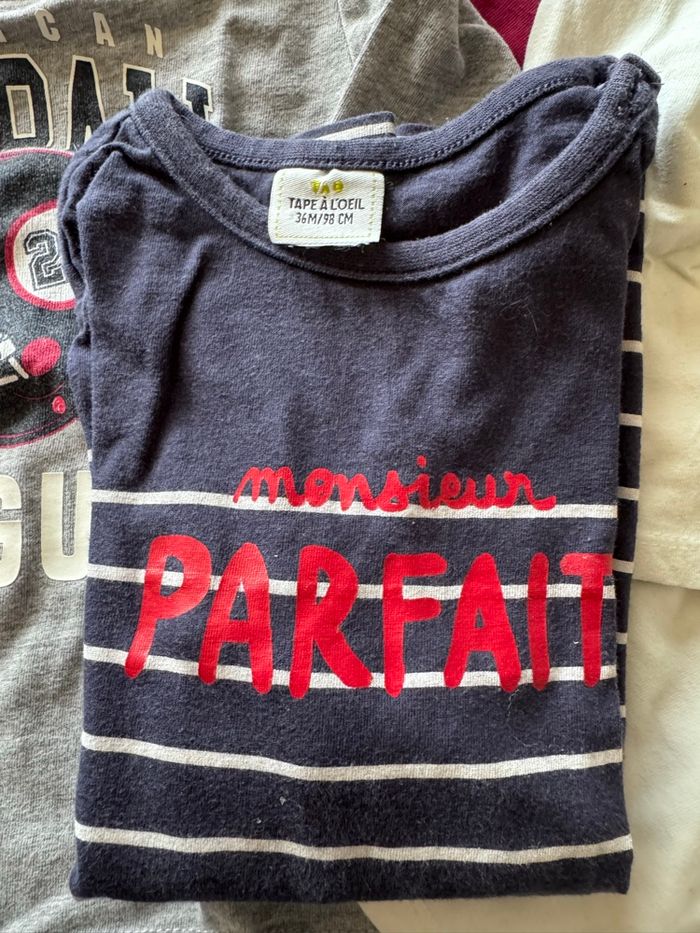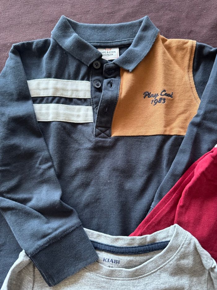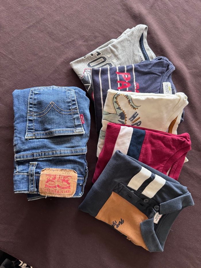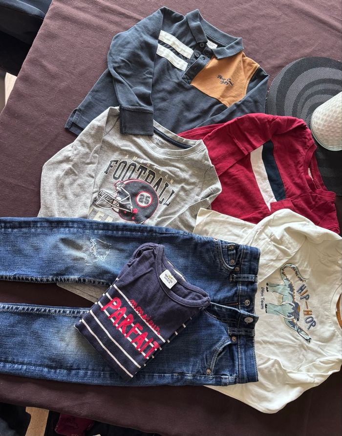 4 t-shirt manches longues en très bon état (dont 3 Tape à l’œil et 1 Kiabi) 1 polo manches longues Tape à l’œil en très bon état 1 jean Levis en bon état avec un trou au niveau du genou J’ai d’autres lots dans mon dressing