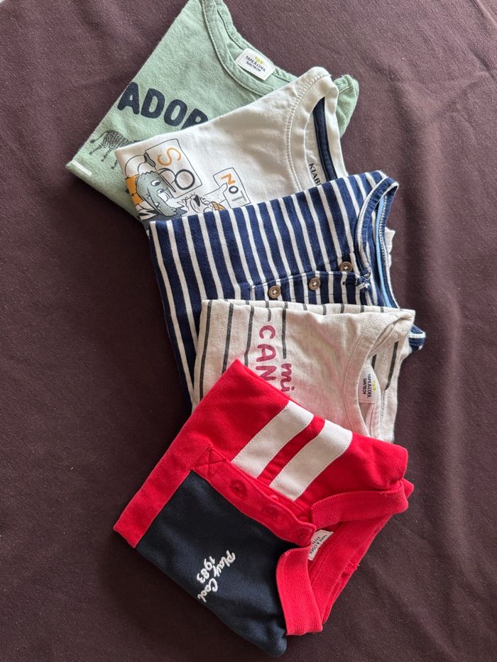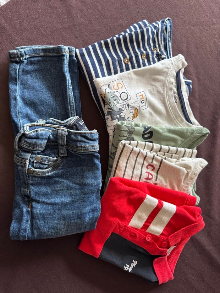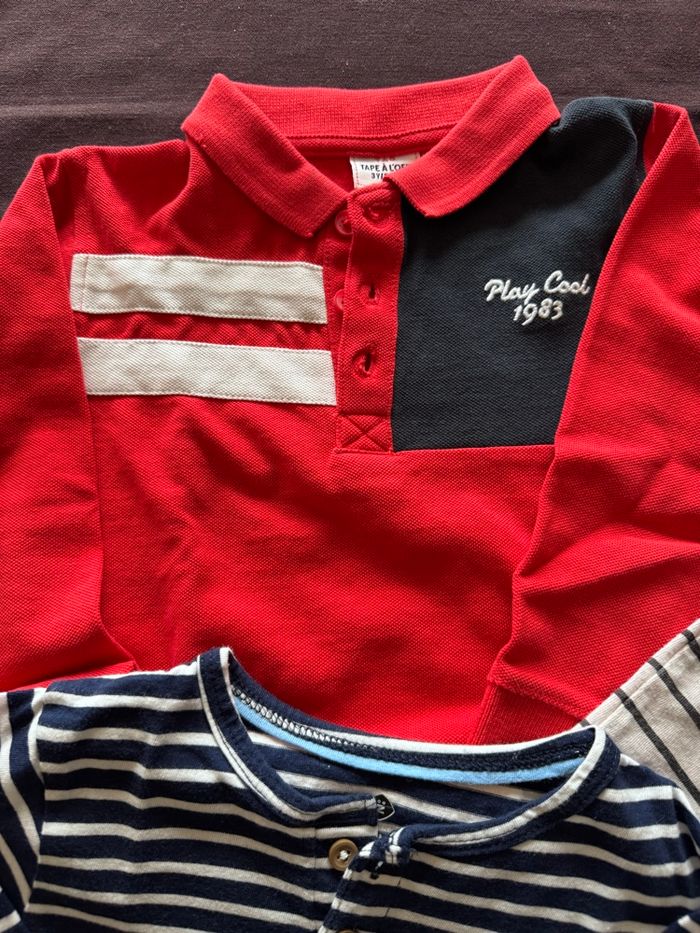 4 T-shirts manches longues en très bon état (dont 2 Tape à l’œil) 1 polo manches longues Tape à l’œil en très bon état 1 jean Tape à l’oeil avec des génois un peu frottés J’ai d’autres lots dans mon dressing