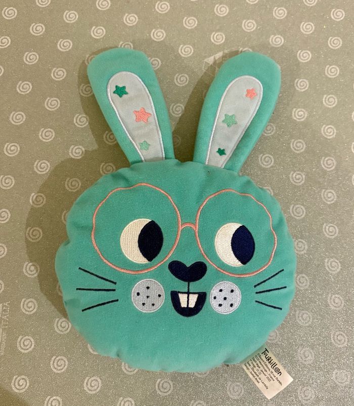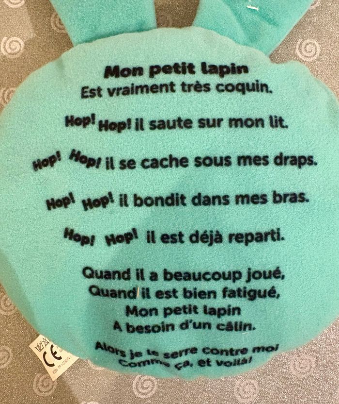 - 1 peluche lapin qui fait du bruit lorsqu’il est secoué, avec petite poésie au dos