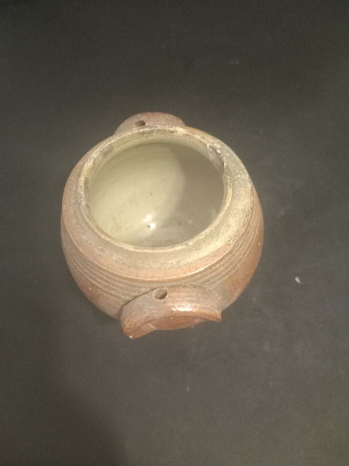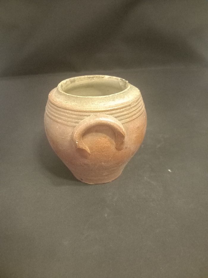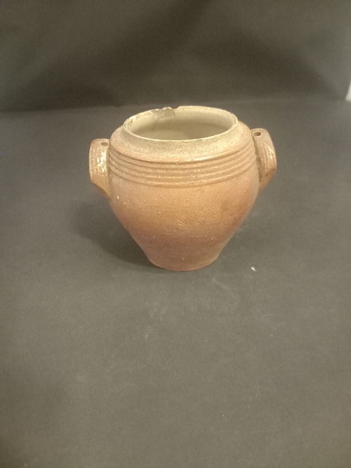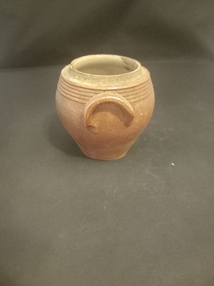 Petit pot Motifs rayures Matière grès Couleurs marron En bon état Dimensions approximative 7,5cm de haut : 9cm au plus large