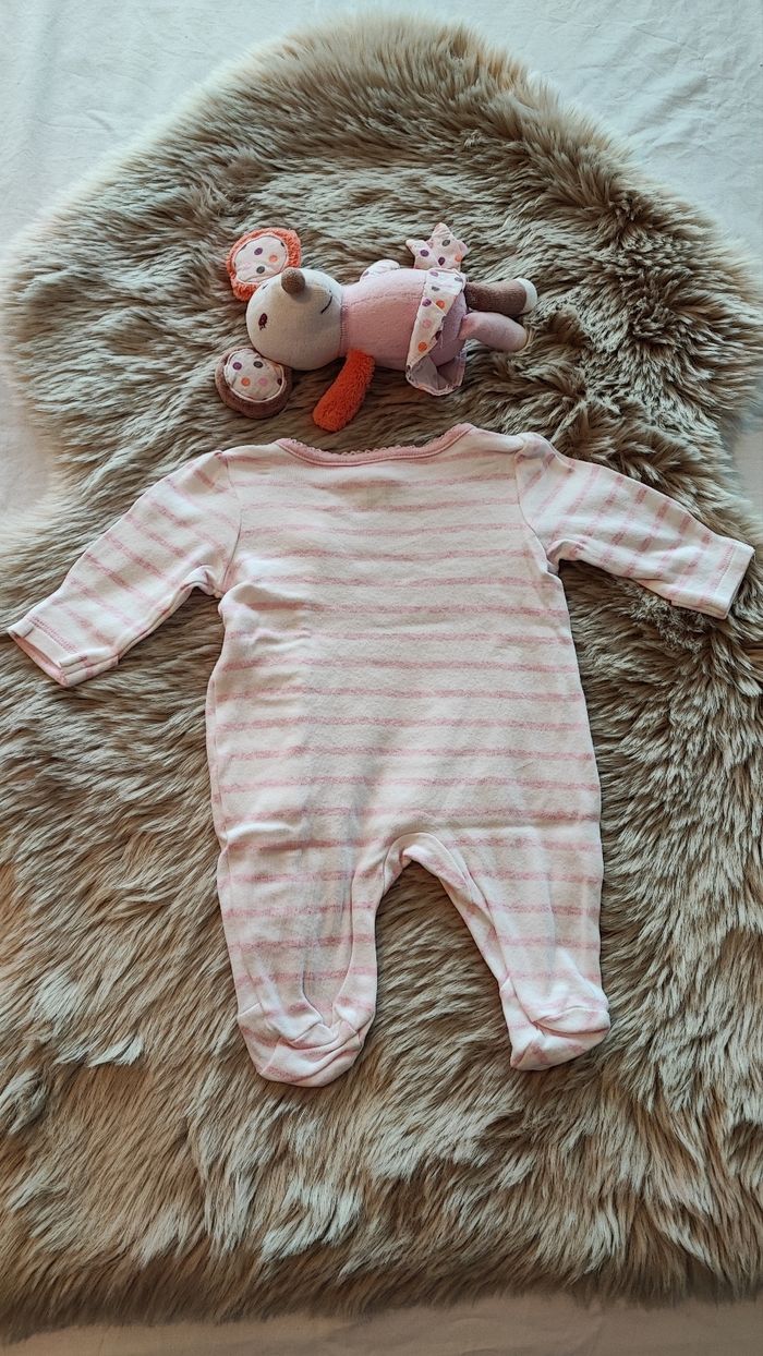 Pyjama fin rose clair et blanc Minnie avec ouverture sur le devant. De la marque Disney de chez c&a En taille 1 mois En très bon état maison non fumeur #laetitia33700filleunmois