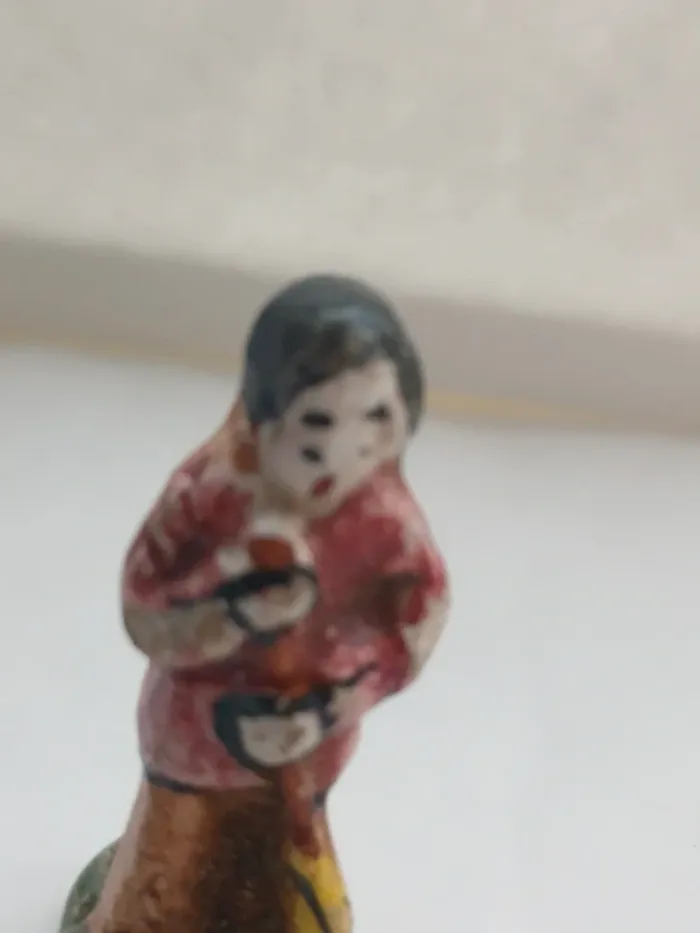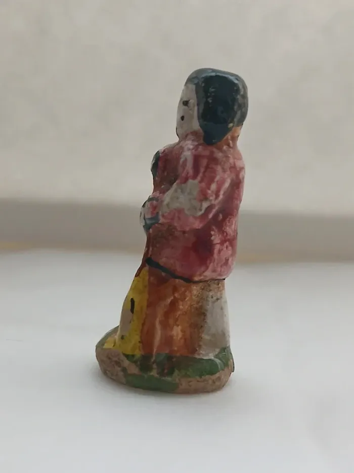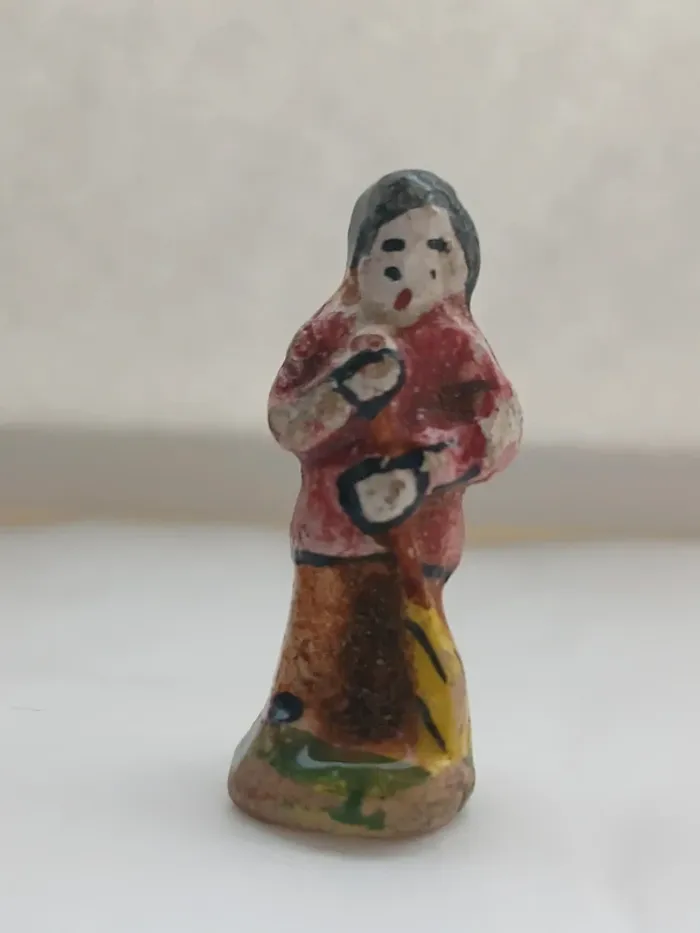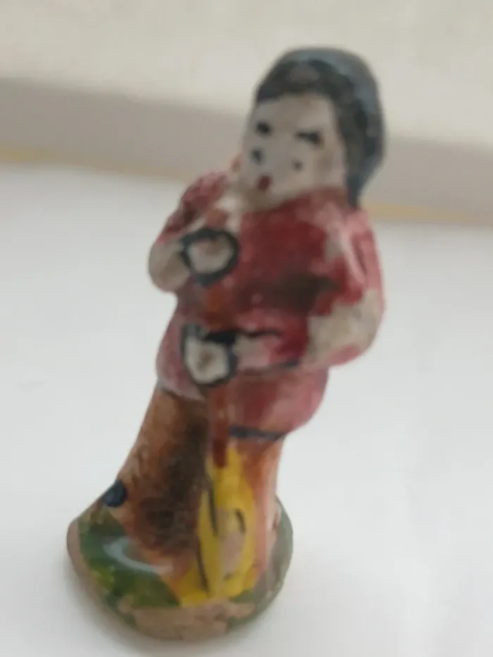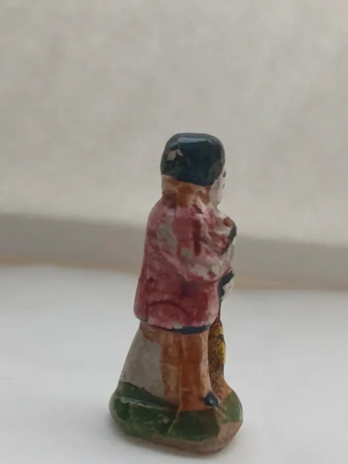 ✨ Description : Charmante fève ancienne représentant un homme tenant un balai, réalisée en céramique émaillée et peinte à la main. Hauteur : environ 4 cm Époque estimée : années 1950 à 1970 Fabrication artisanale, sans inscription au socle (typique des fèves provençales anciennes). Bon état général pour son âge — légères marques du temps visibles sur la peinture, ce qui fait tout son charme vintage. 🏺 Détails : Thème : Santons / Métiers du village Matière : Céramique ou faïence émaillée Couleurs : rouge, marron, jaune et vert Provenance : collection privée Pièce unique, non industrielle 💶 Prix : 👉 8 € (négociable légèrement) Envoi possible par courrier protégé ou remise en main propre Haute-Garonne (31)