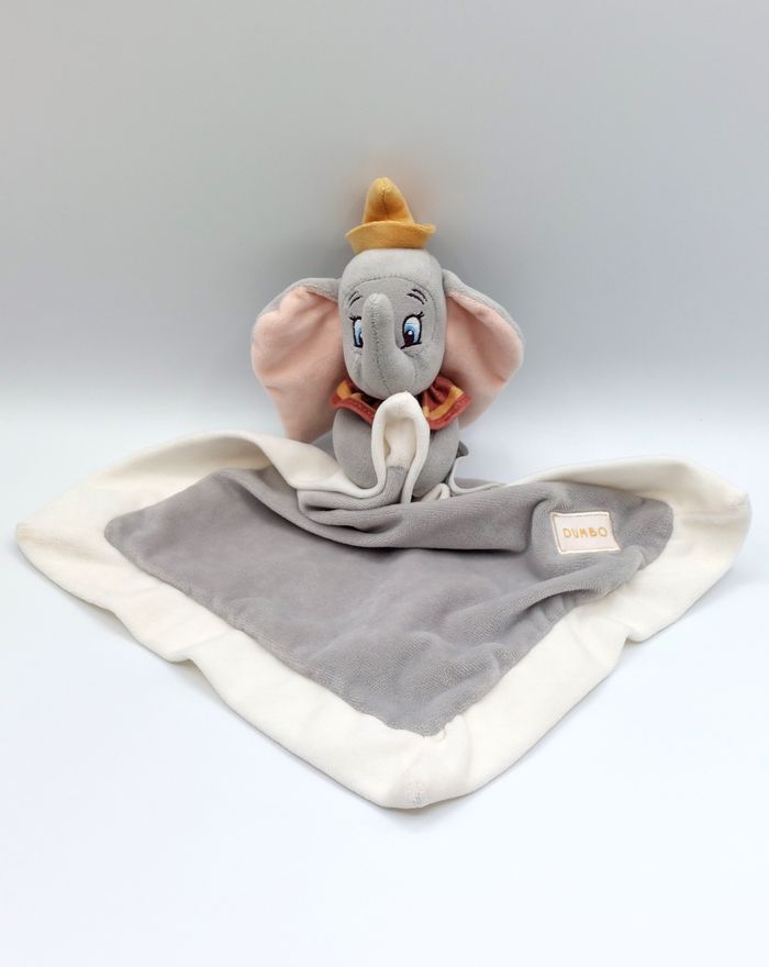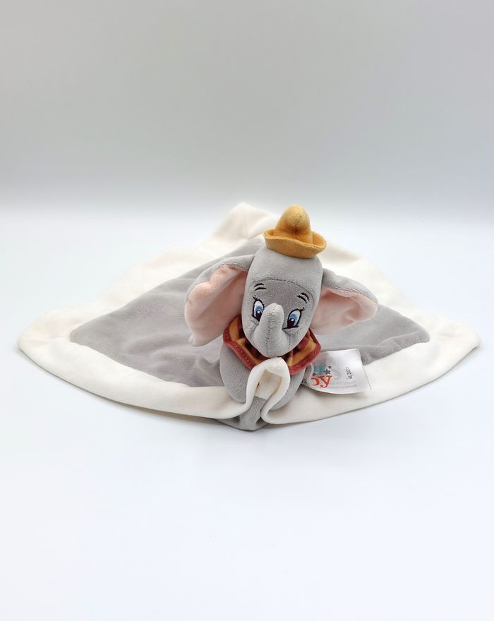 Doudou peluche éléphant Dumbo Disney Baby gris blanc chapeau jaune collerette