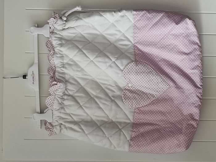 Adorable sac à jouets type baluchon, parfait comme cadeau de naissance pour une petite fille 🌸 En coton épais et doublé (ouate intégrée) pour une belle tenue. Partie basse et poches en coton à pois rose avec formes de cœur, partie haute et intérieur en coton uni. Se ferme facilement avec un cordon de serrage. 💗 Grand contenant, idéal pour ranger jouets, doudous ou affaires de bébé. 🧺 En excellent état (Puer42)