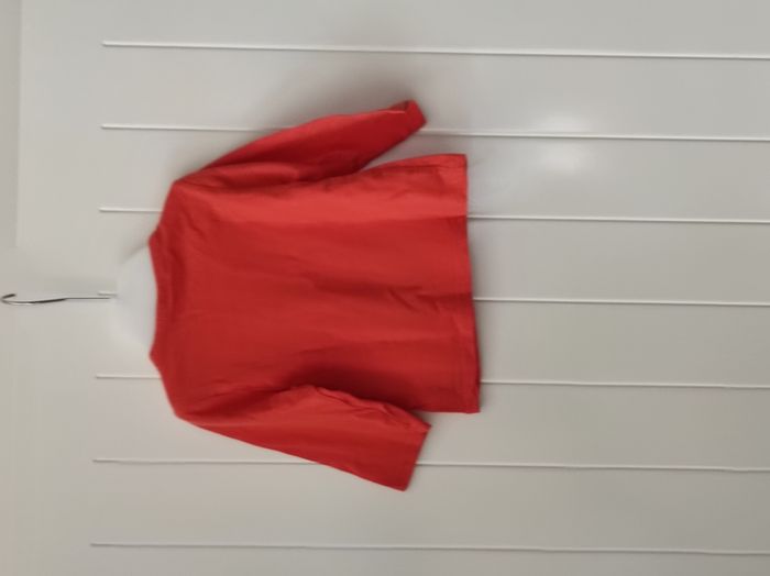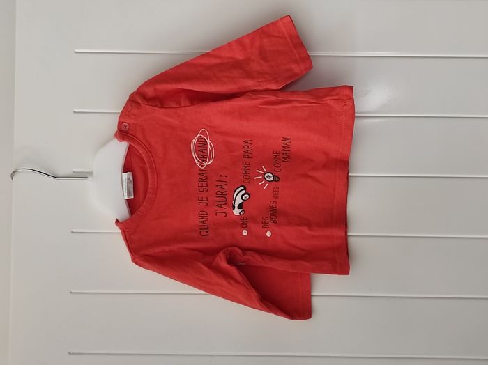 Adorable t-shirt manches longues pour bébé garçon, taille 9 mois. Coloris orange, avec motif message sur le devant. Pratique : ouverture à 2 boutons sur l’épaule pour un enfilage facile. 💫 En très bon état (Vet616)