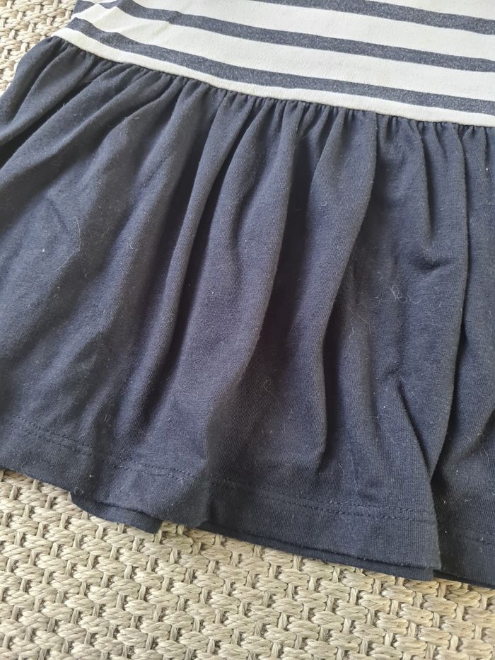 Robe courte bleue marine rayée motifs "marins corsica" souvent portée mais en bon état. Idéale pour l'été. Marque Cap au large - taille 4ans.