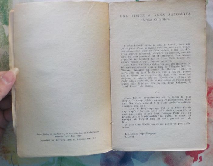 LA MERE de Maxime GORKI Ed. Hier et Aujourd'hui 1945 Etat correct 1ère de couverture presque détachée pages très jaunies tranche abimée 4ème de couverture détachée sur un cm en haut
