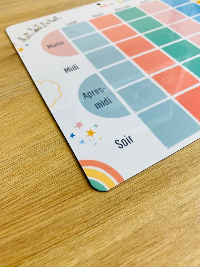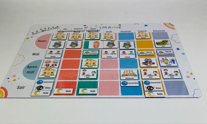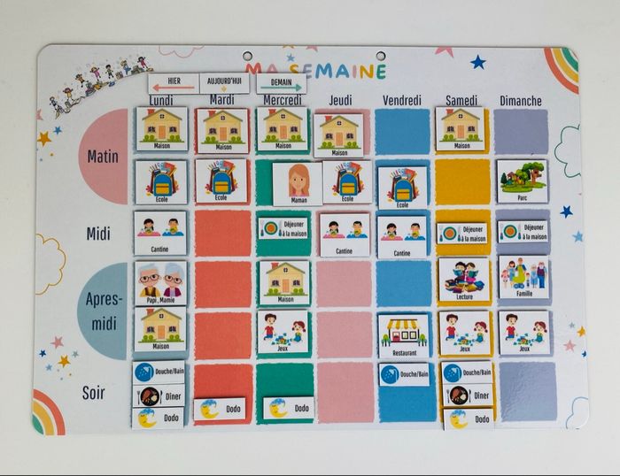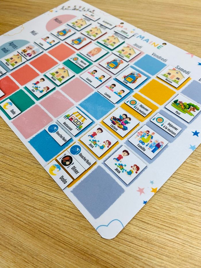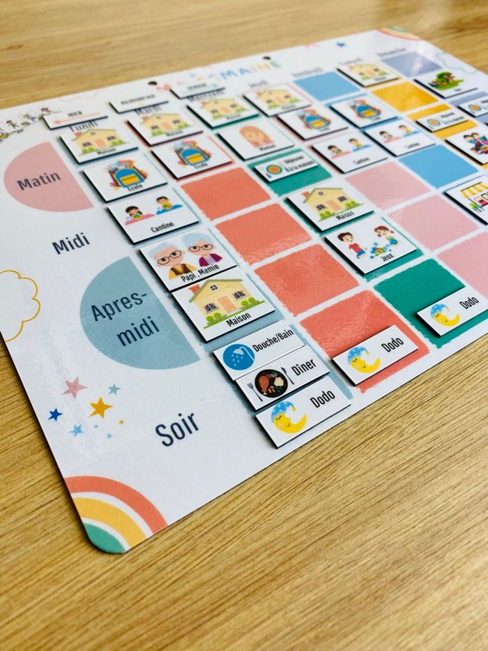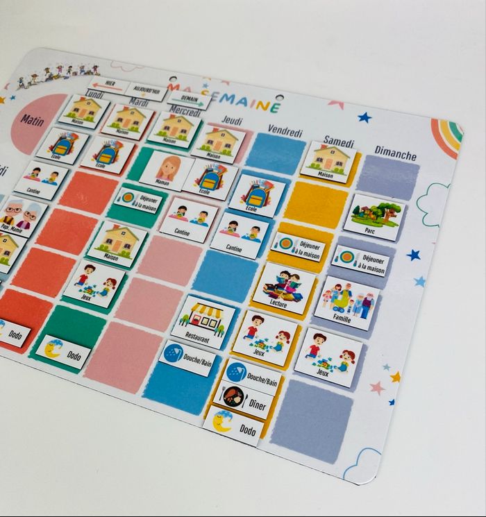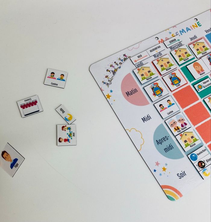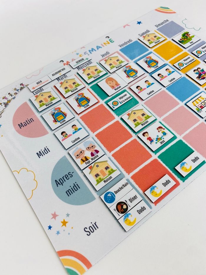 Petit semainier magnétique enfant A4 🗓️ 100 magnets inclus pour organiser la semaine, gagner en autonomie et réduire le stress familial. ✨ Un petit semainier, à prix tout doux ! ✨ Votre enfant vous demande sans cesse : « C’est quand la cantine ? », « J’ai sport aujourd’hui ? » Avec ce semainier magnétique compact, vous apportez des réponses claires et rassurantes… tout en rendant l’organisation familiale ludique et motivante. 👉 Conçu au format A4, avec ses 100 magnets variés (lecture, peinture, jeux, repas, sorties…). Sa taille compacte est un vrai avantage : facile à poser sur le frigo ou au mur, il reste toujours à portée de regard sans encombrer. 💡 Les bénéfices : • L’enfant visualise sa semaine et gagne en autonomie. • Moins de stress et de questions répétées pour les parents. • Un prix attractif, permettant d’équiper chaque enfant de son propre semainier pour éviter les conflits et favoriser l’organisation individuelle. Un petit format, mais un grand soutien dans le quotidien familial ✨. 📏 Dimensions : 21 x 29,7 cm (format A4) Contenu: 1 semainier magnétique 100 Magnets 10 Maison 10 École 7 Sieste 4 Cantine 4 Écrans 4 Lecture 4 Jeux 1 Parc 1 Fêtes 1 Sport 1 Dentiste 1 Bibliothèque 2 Maman 2 Papa 1 Périscolaire 1 Centre de loisir 1 Famille 1 Vélo/Trottinette 1 Copains/Copines 1 Coiffeur 1 Papi/Mamie 1 Activité manuelle 1 Anniversaire 1 Promenade 1 Nounou 1 Cinéma 1 Restaurant 1 Courses 1 Médecin 1 sortie scolaire 1 Piscine 1 Rangements / Ménage 7 Dodo 7 Dîner 7 Douche/Bain 7 Déjeuner à la maison 1 Aujourd'hui 1 Hier 1 Demain Créativement vôtre 🙂 Attention : Ceci n'est pas un jouet à utiliser sous la surveillance d'un adulte