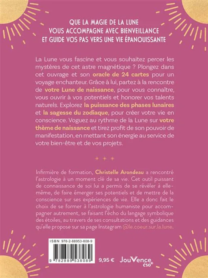 Que la magie de la lune vous accompagne avec bienveillance et guide vos pas vers une vie épanouissante et pleine de sens ! Depuis toujours, la Lune est source de fascination. Cet ouvrage et son oracle de 24 cartes vous invitent à percer les mystères de cet astre magnétique et enchanteur et à utiliser sa magie au quotidien de manière concrète. Partez à la rencontre de votre Lune de naissance, pour vous connaître, vous ouvrir à vos potentiels et honorer vos talents naturels. Explorez la puissance des phases lunaires et la sagesse du zodiaque, pour créer votre vie en conscience. Voguez au rythme de la Lune sur votre thème de naissance et tirez profit de son pouvoir de manifestation, en mettant son énergie au service de votre bien-être et de vos projets.