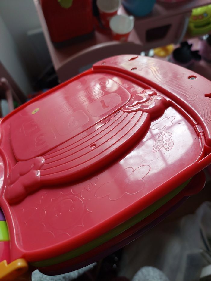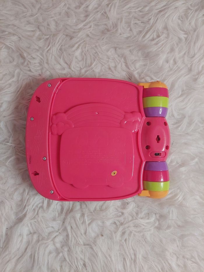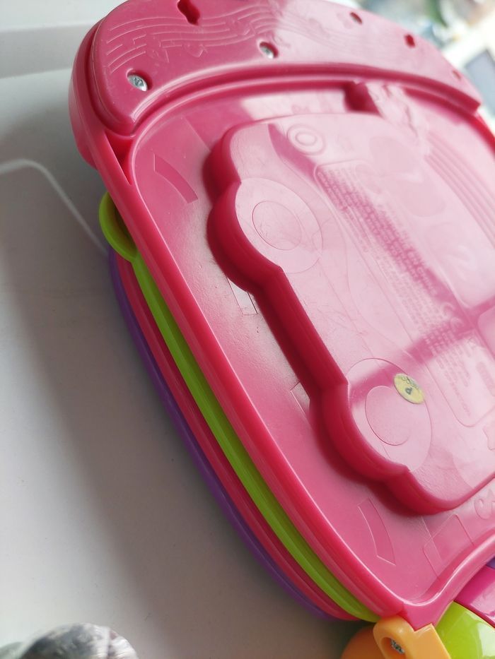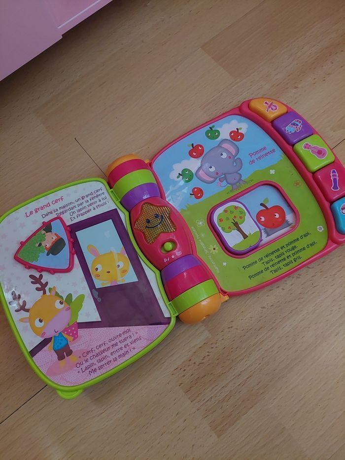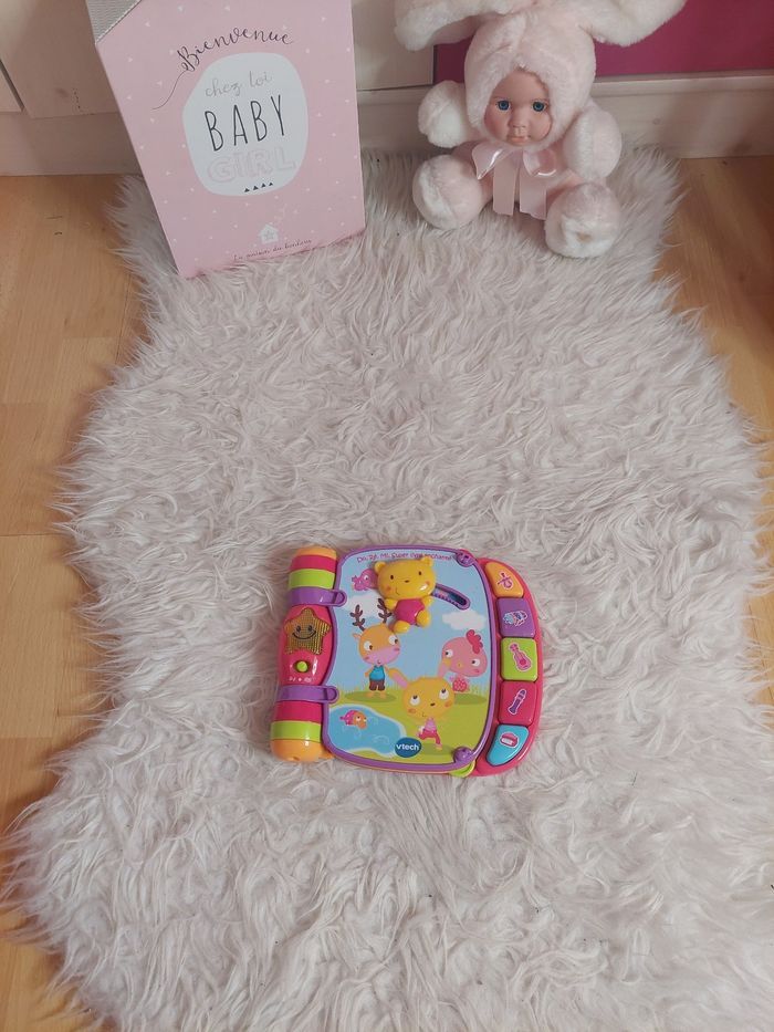 〰️ Do, Ré, Mi Super Livre Enchanté rose est un livre parlant et musical qui joue 6 comptines traditionnelles joliment illustrées. Grâce à lui, bébé pourra s'initier au piano en appuyant sur les boutons colorés. Il découvrira ainsi les instruments de musique et leur son. Les effets sonores émis lorsque les animaux en relief sont manipulés ainsi que l'étoile lumineuse raviront bébé ! Des objets en relief à manipuler pour déclencher des effets sonores et des petites phrases. - 10 mélodies et 6 chansons. -  5 boutons colorés à manipuler pour jouer de la musique et découvrir les instruments. - Bébé découvre les couleurs, les instruments et de nouveaux mots au travers des chansons - Tourner les pages du livre et manipuler les formes développe la coordination main/oeil de Bébé - Une voix sympathique, les mélodies et les chansons encouragent Bébé à chanter - Les 6 chansons, leurs mélodies et les effets sonores éveillent Bébé à la musique - Les couleurs vives des pages et les effets lumineux stimulent la vue de Bébé - Chaque forme à manipuler développe une habileté motrice différente : appuyer, faire glisser, faire tourner 🌸 Etat : BE vendu sans piles(quelques traces de frottements derrière le livre -> voir 2 dernières photos mais n'empêche en rien son bon fonctionnement) j'ai une vidéo du jouet en fonction 🌸 Marque : Vtech 🌸 Age : à partir de 6 mois 🏷 Les réductions sur les lots sont activées ⏳️ Pas de réservation ✂️ Les colis sont soigneusement emballés 🎁 Un petit cadeau sera mis dans chaque colis #virginie63zjouet #virginie63zbébé