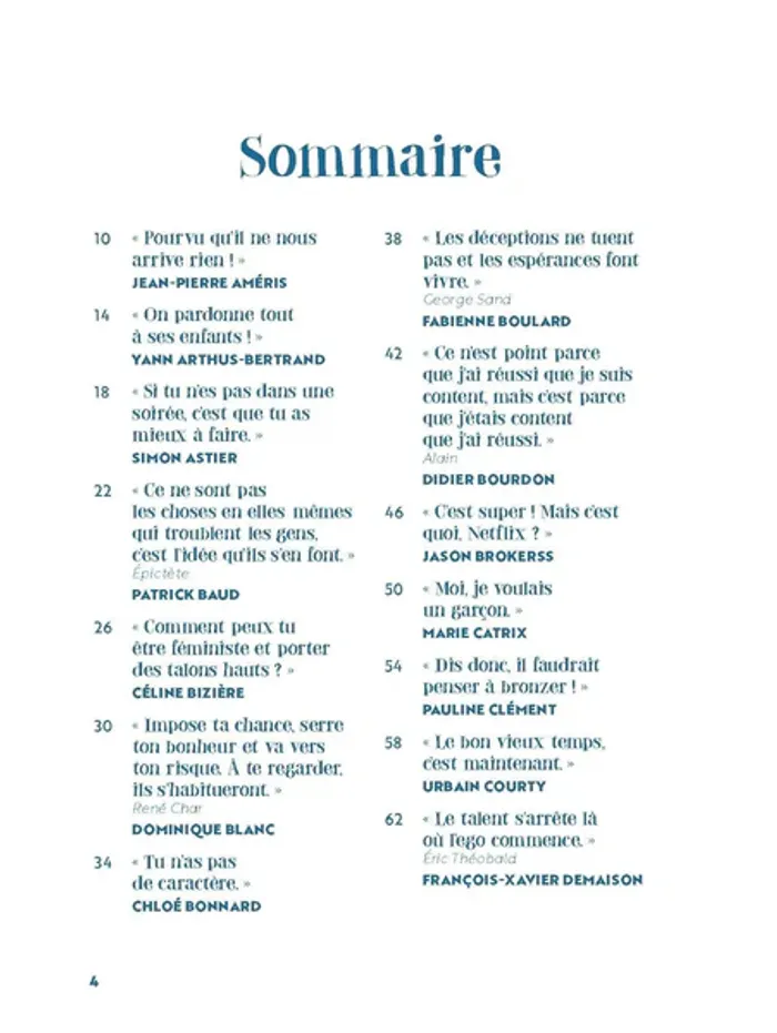 Pour ce livre, j'ai eu le privilège d'échanger avec 60 personnalités afin qu'elles me confient la phrase qui a changé le cours de leur vie. Toutes incitent à réfléchir, à se poser des questions. C'est ce que je vous invite à faire à votre tour pour mieux vous connaître. J’espère que ces mots vous porteront autant qu’ils m’ont transportée… Découvrez les récits de : Yann Arthus-Bertrand, Dominique Blanc, Didier Bourdon, Cyril Dion, Lola Dubini, Lorie, Juliette, du groupe L.E.J., Linda Hardy, Alexis Michalik, Frank Leboeuf, Mimi Mathy...