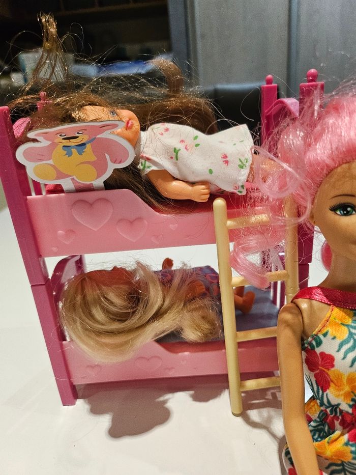 Lot de 3 poupées style barbie comprenant: - 1 femme - 2 petites filles - 1 lit superposé