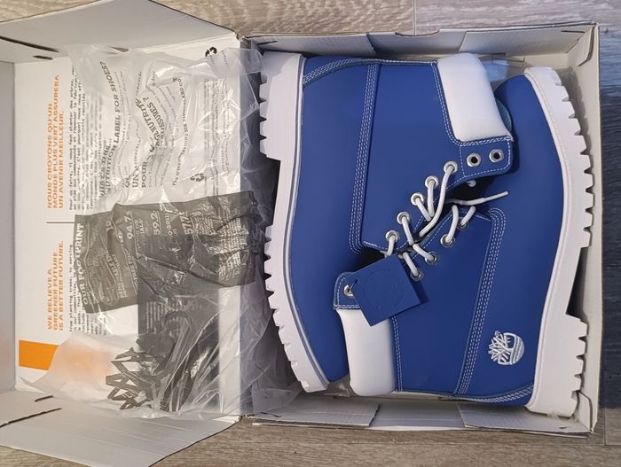 Bottes Timberland bleu et blanc waterproof. Paire neuve jamais portée. Dans sa boîte d'origine. Prix non négociable. Parfait pour un cadeau pour cette hiver. Pointure: Taille 44 Envoi rapide dans les 24H assuré.