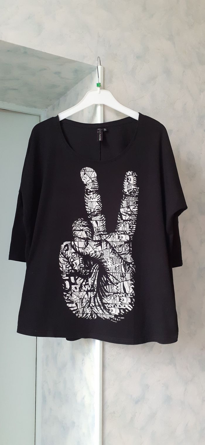 Vends un tee-shirt coupe large, manches 3/4 chauve souris resserrées, 100 % coton, couleur noir avec un motif blanc devant, marque Rainbow, taille 36-38. Longueur dans le dos : 60 cm.