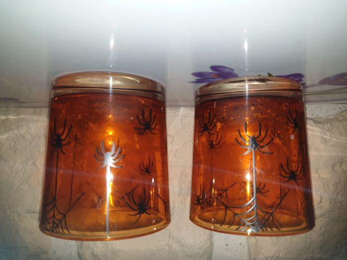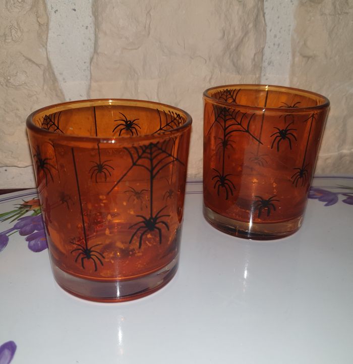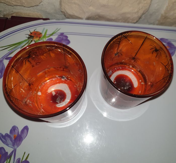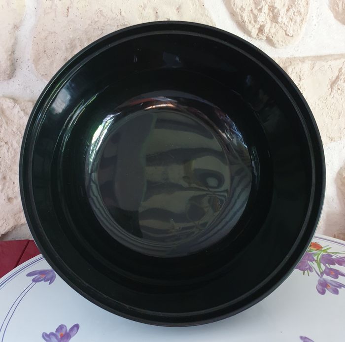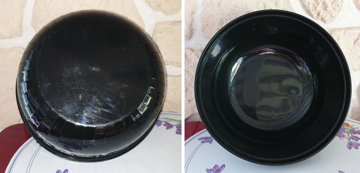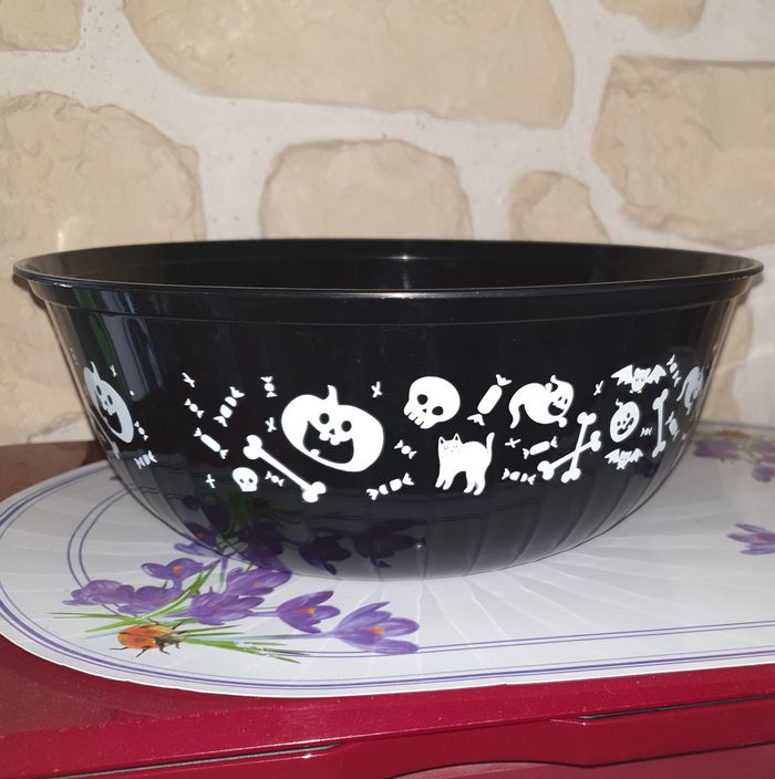Salader plastique de 28.5 cm de diamètre et 11 cm de hauteur, a servi une fois. 2 verres photophores de 7 cm de diamètre et 8 cm de haut, ils ont servis plusieurs fois et présentent des traces de bougie à l'intérieur.