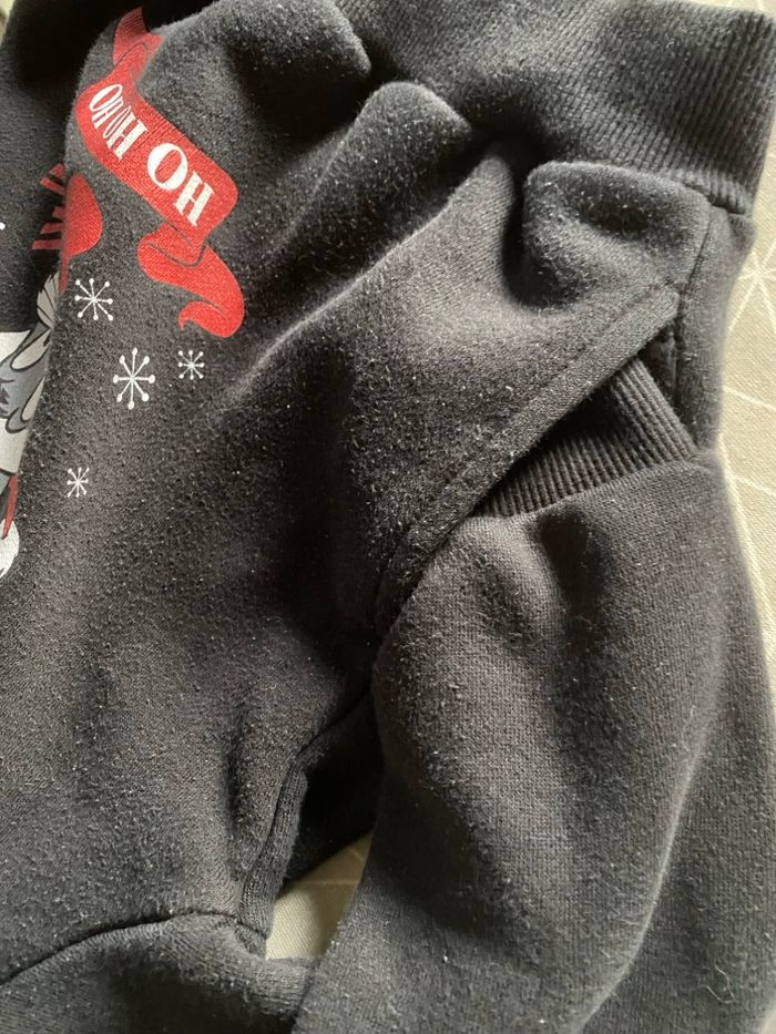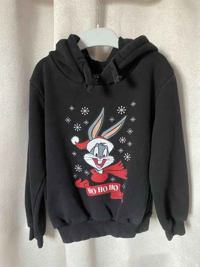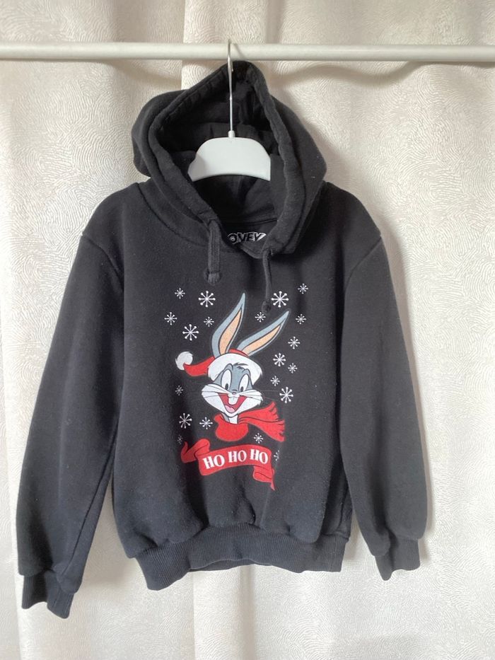Pull sweat à capuche noir molletonné 2 poches Motif bug Bunny Noel Taille 6 ans 70% coton 30% polyester Looney tunes Bon état pour Noir blanchi et bouloches
