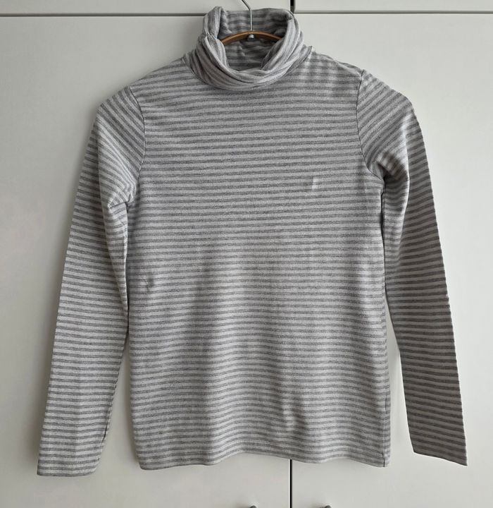 Sous pull de marque Tex, taille 9/10 ans, 69% coton, 15% polyester, 5% viscose, 7% fibres metalliques, 4% élasthanne. Rayé gris clair / gris, effet pailleté.