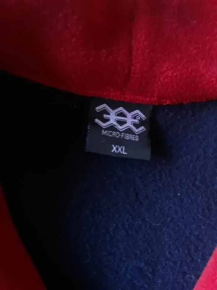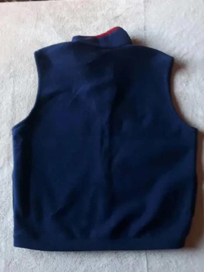 Marque #EBE, très belle qualité Polaire bleu marine, col rouge, sans manche, deux poches, Taille XXL, microfibres, 100% polyester Dimensions à plat: épaule 50 cm., sous aisselle 64 cm., hauteur 70 cm.
