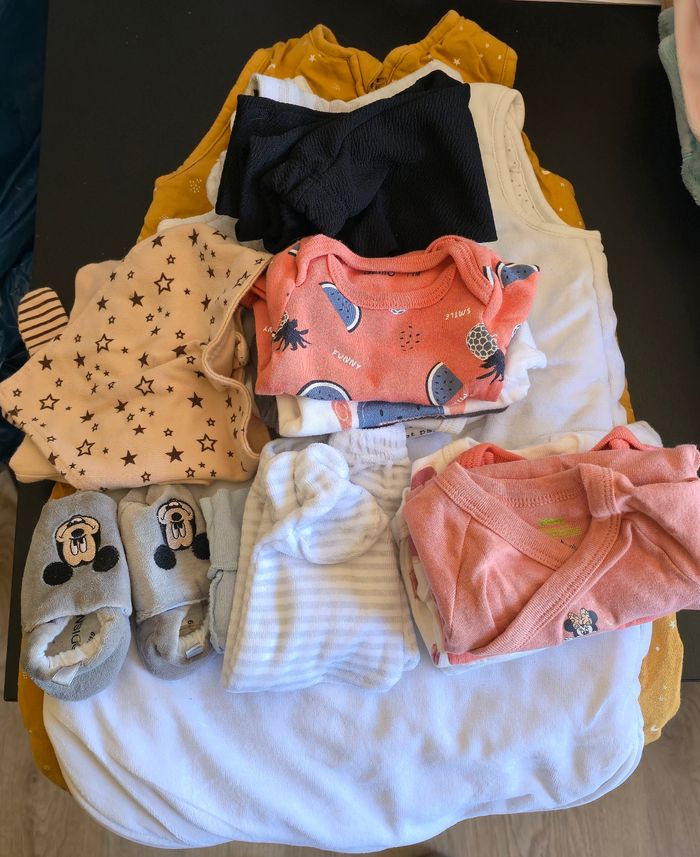 5 body manche longue, 5 body manche court, 4 pyjama, 3 pantalons, 2 turbulettes, 1 paire de chausson, un ensemble bonnet fin avec son bandana. Divers chaussettes. Un paquet de couches naissance non entamé et un entamé de 2 à 5kg