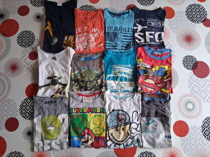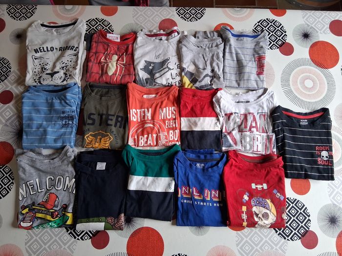 Lot vêtements garçons 6 ans divers marques 2 gilets dont 1 sans manches 16 tee shirt manches longues 4 pantalons 12 tee shirt sans manches