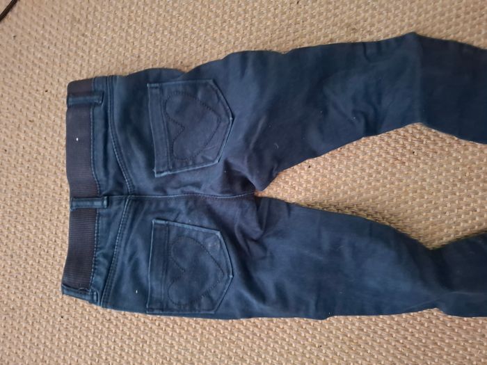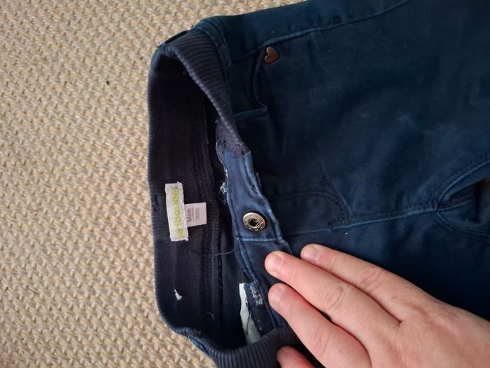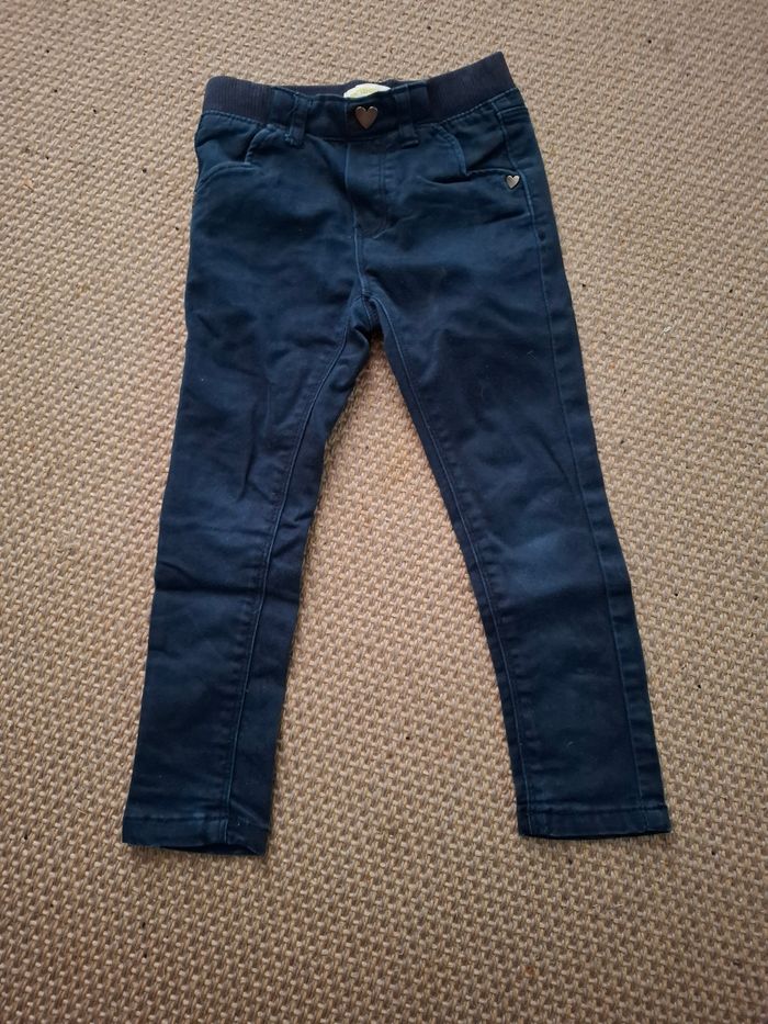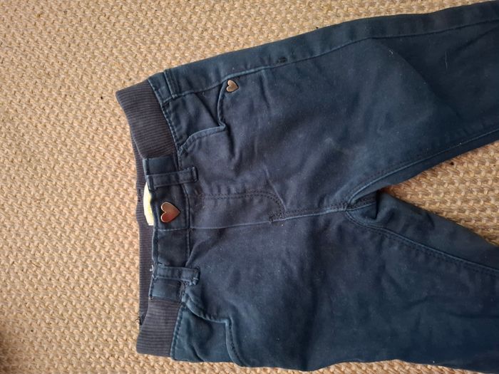 pantalon de couleur bleue marine, avec des motifs de coeur. Petite tache sur le devant du pantalon, malgrés le lavage