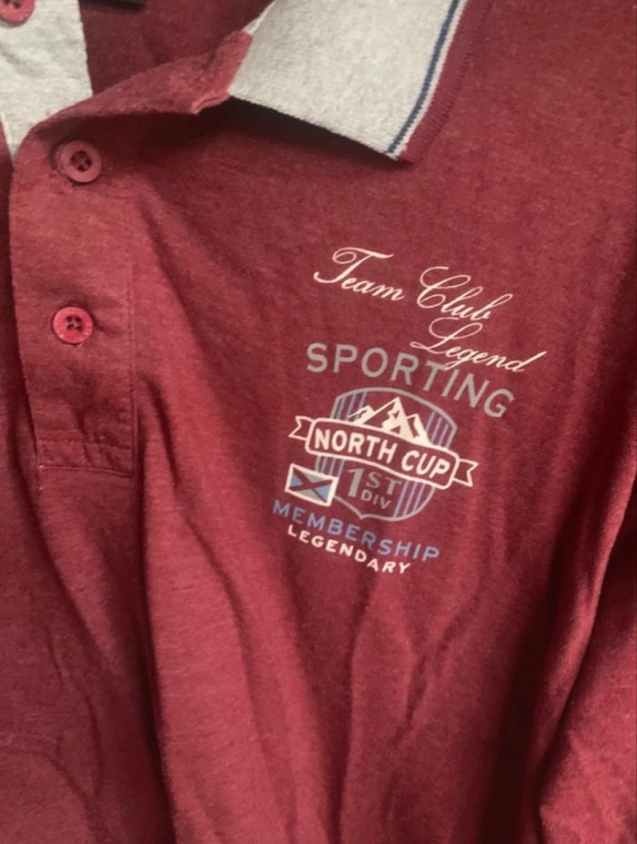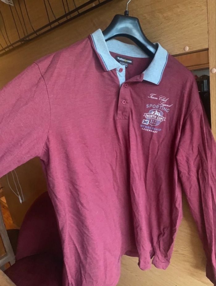 Polo bordeaux avec col contrasté gris, manches longues, logo brodé North Cup Sporting. Confortable, style sport/casual, idéal pour la mi-saison. 📏 Taille : 2XL (taille française) ⚡ État : très bon état, peu porté